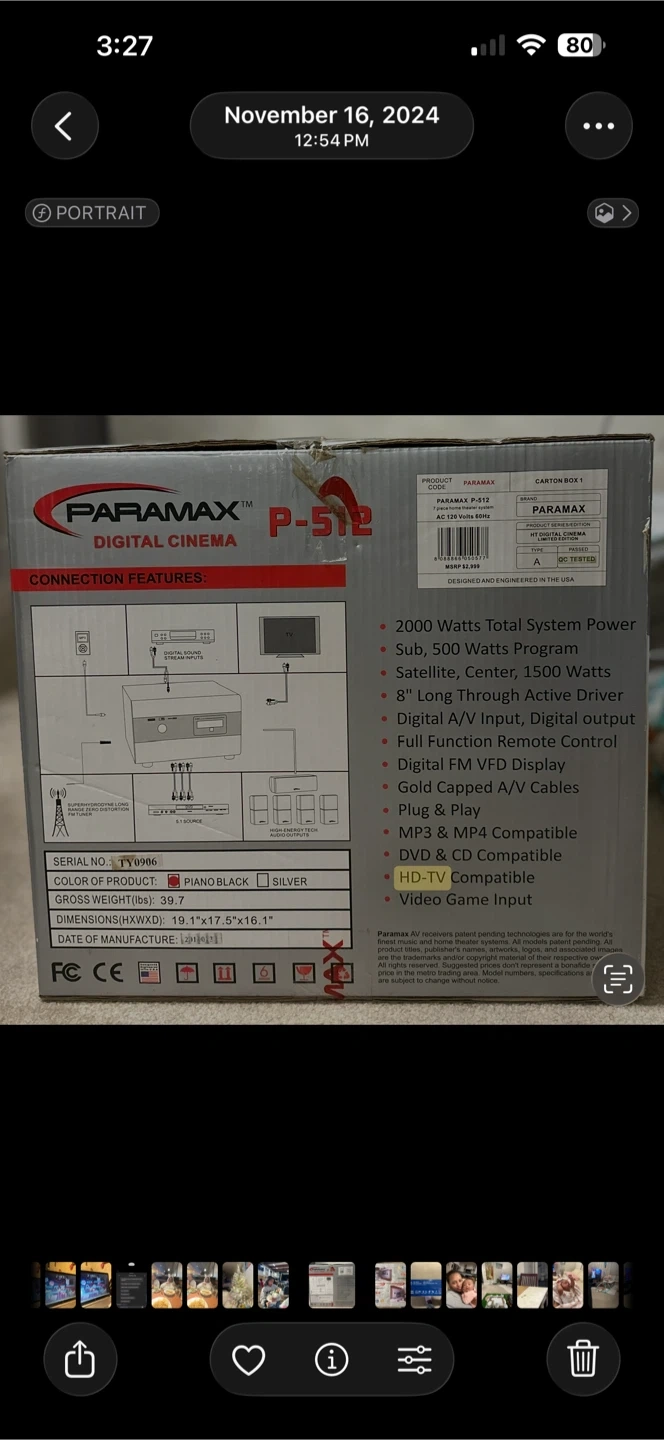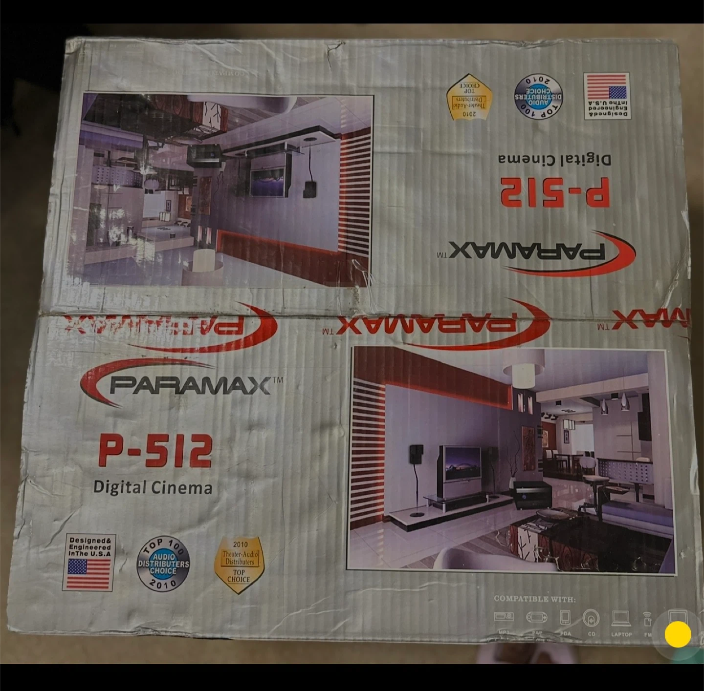 Selling a Paramax P-512 Digital Cinema system. It boasts 2000 watts total system power, with 500 watts for the subwoofer and 1500 watts for the satellite speakers. It features an 8" long-throw active driver, a digital FM VFD display, and comes with gold-capped A/V cables. Plus, it's compatible with DVD and CD, and is HD-TV compatible for video game input! The color is Piano Black.