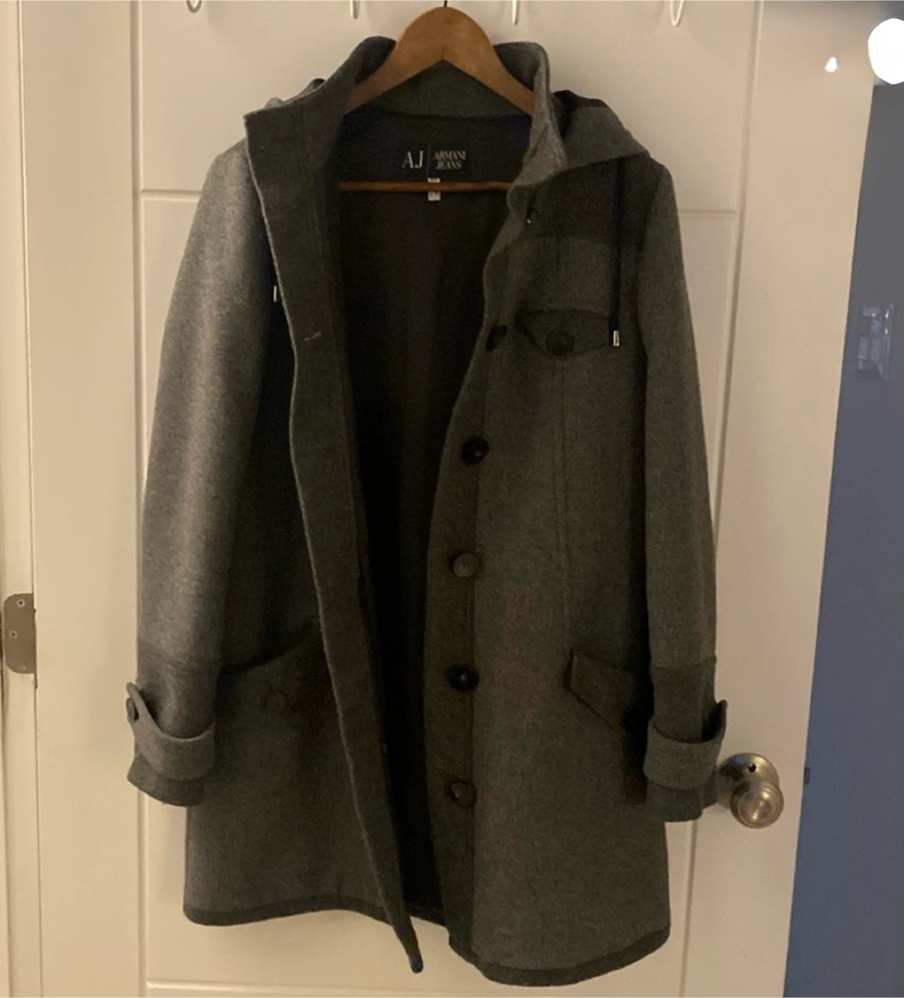 Selling a stylish Armani Jeans hooded coat in size 40. It's a lovely grey colour and made from a wool blend, perfect for keeping warm during cooler weather. The coat has a hood and button closure. It's in great condition and ready for a new home! Worn twice only.