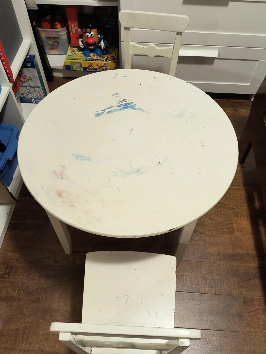 Selling a cute kids' white round table with chairs! It's perfect for arts and crafts, snack time, or just hanging out. There are some signs of use on the table top, as you can see in the pictures, but it's still got lots of life left in it for your little ones.