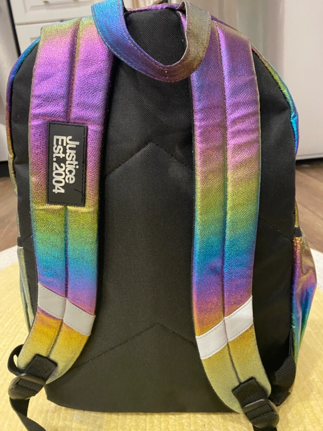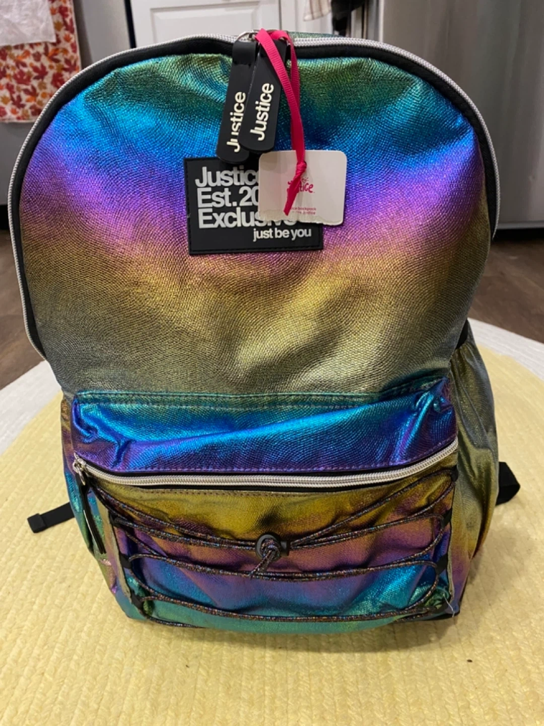 This Justice backpack features a cool iridescent design that catches the light beautifully! It has a spacious interior with the Justice logo pattern. Perfect for school or everyday adventures