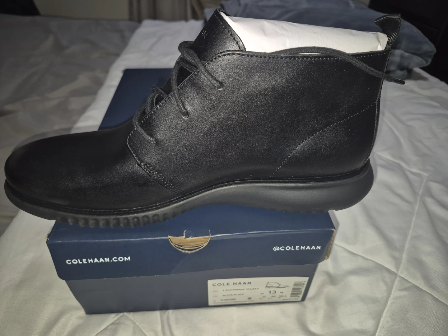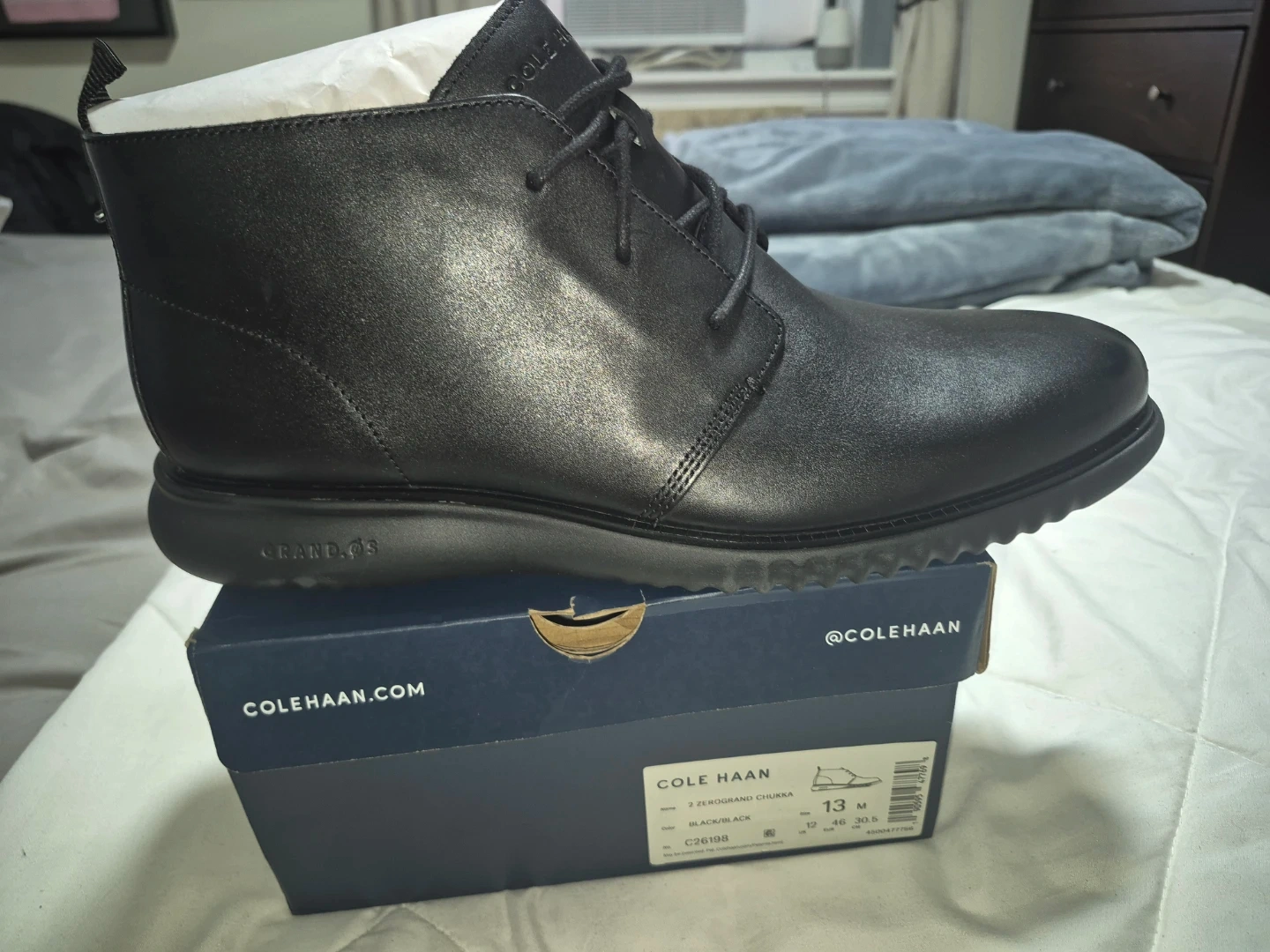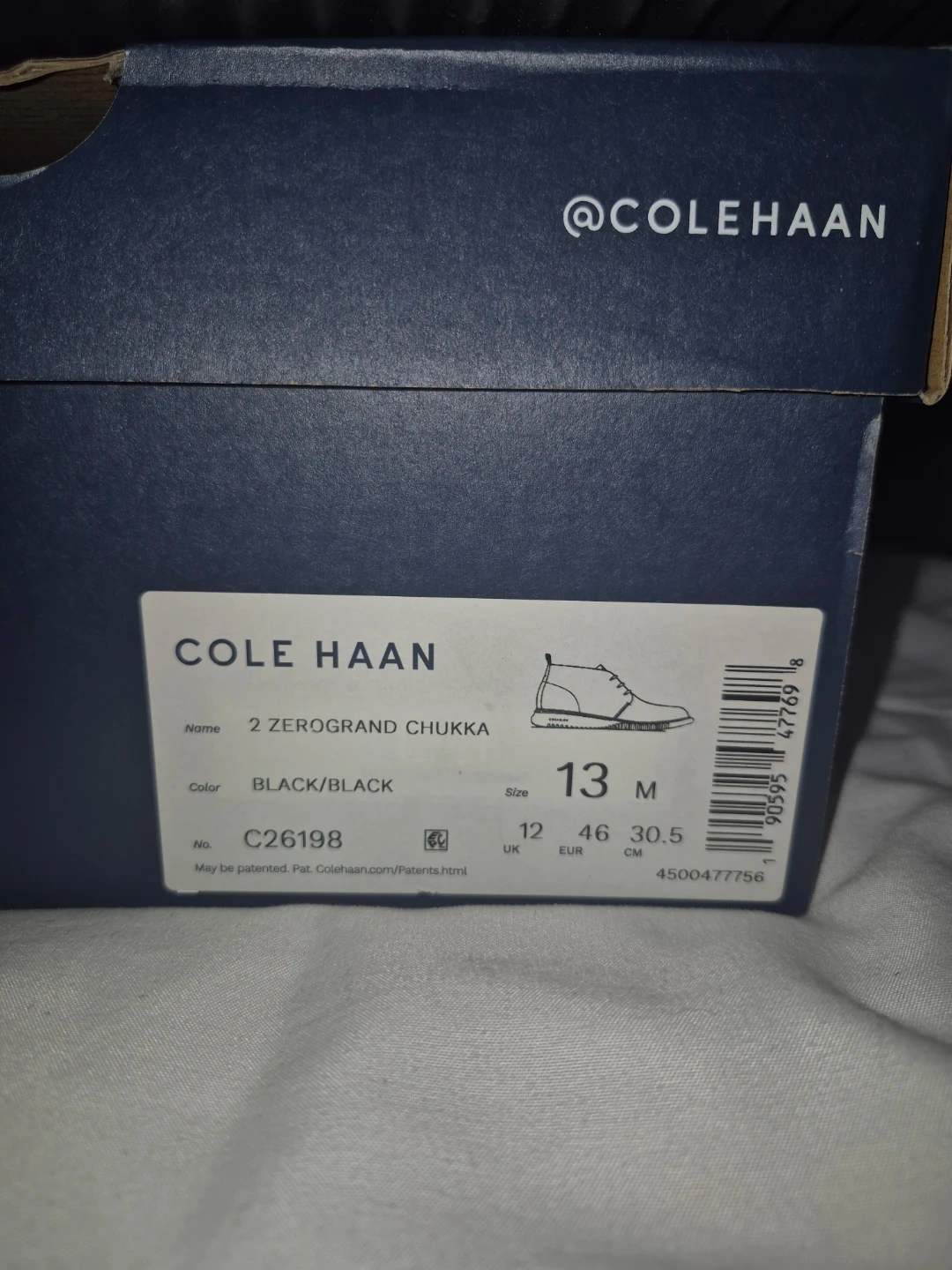 Selling a pair of Cole Haan 2 Zerogrand Chukka boots in black, size 13M. They come with the original box. Great condition!