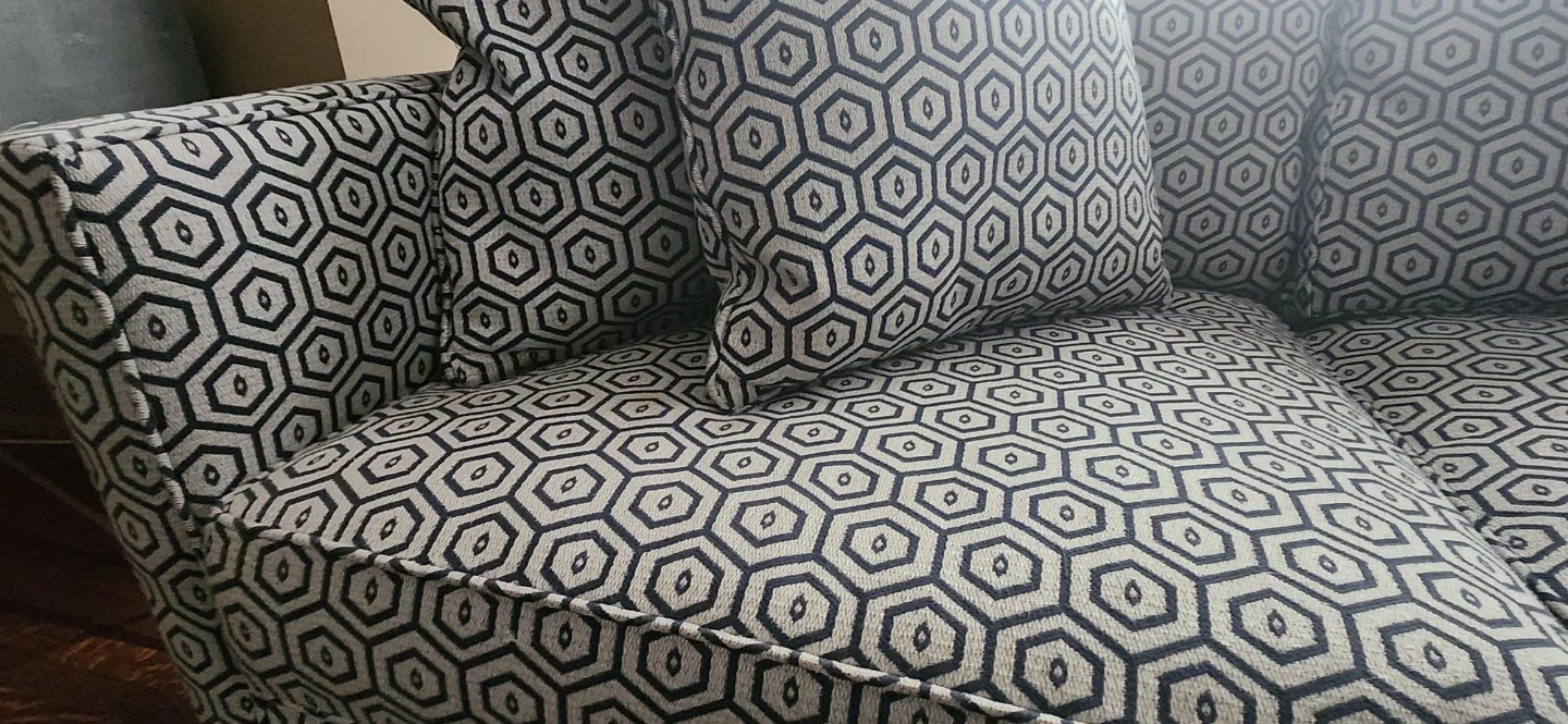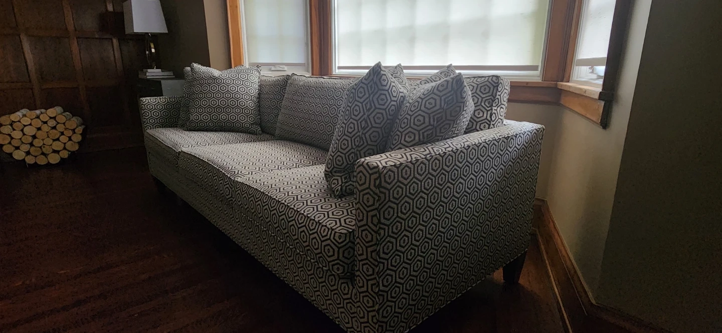 Beautiful, traditional living room couch. Originally purchased new at Elte with custom fabric. Gorgeous with neutral and navy tones. 4 side pillows in same fabric. 90" long and 35" deep.