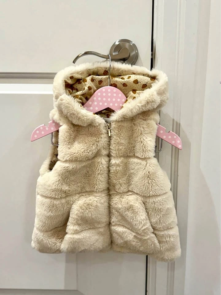 Adorable Zara baby faux fur vest, size 12–18 months (label 86). In like-new condition, worn only once or twice. Soft cream faux fur with a cozy hood and the cutest little pumpkin-pattern lining 🎃 perfect for autumn photos, outings, or layering on chilly days.