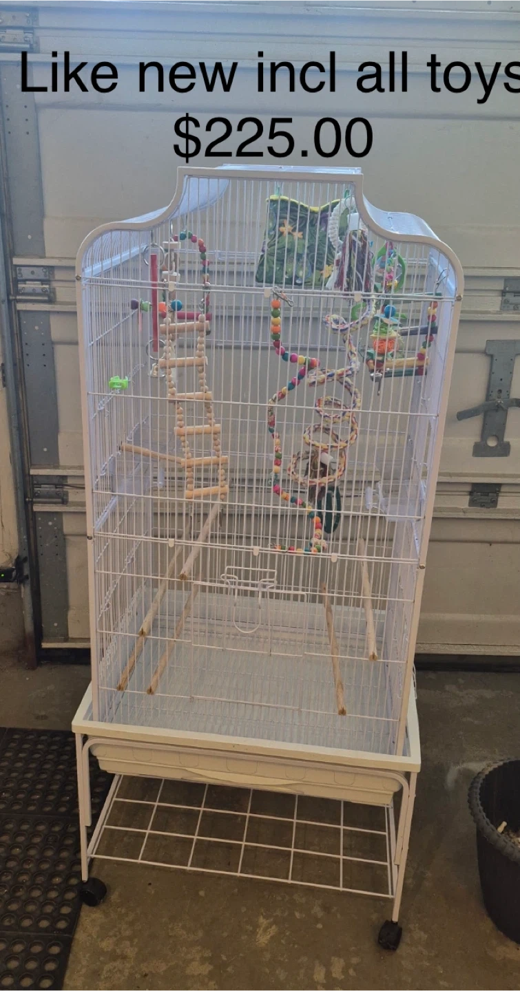 Selling a bird cage that's like new! It comes with all the toys you see in the picture. It's in great condition and ready for a new feathered friend