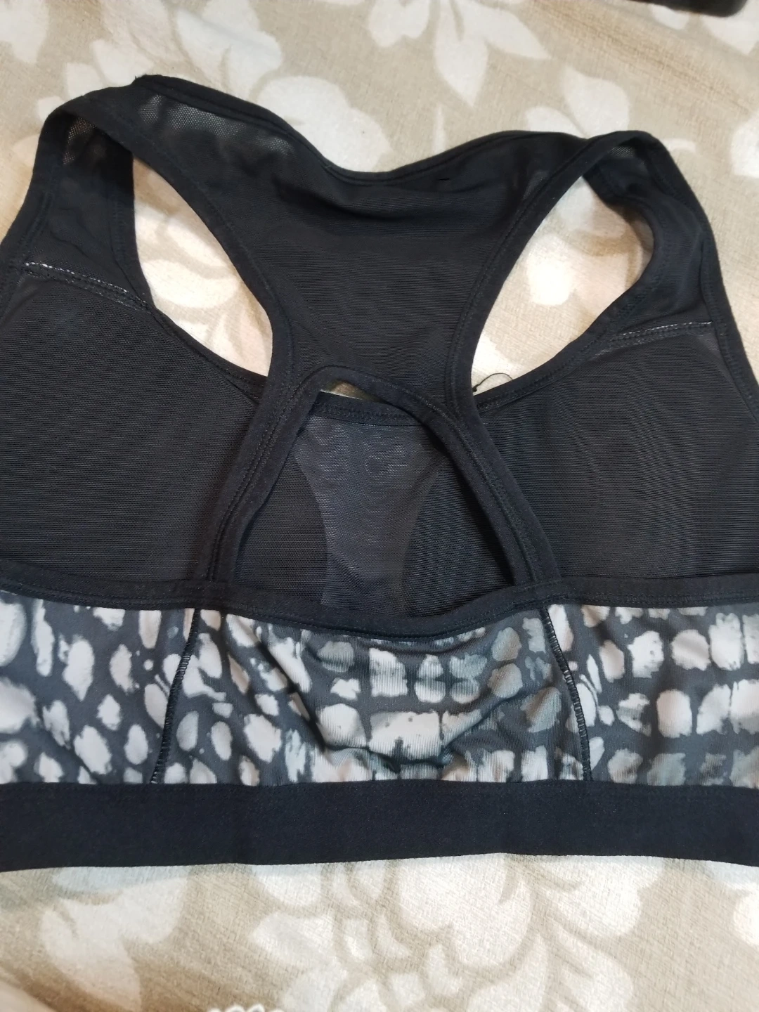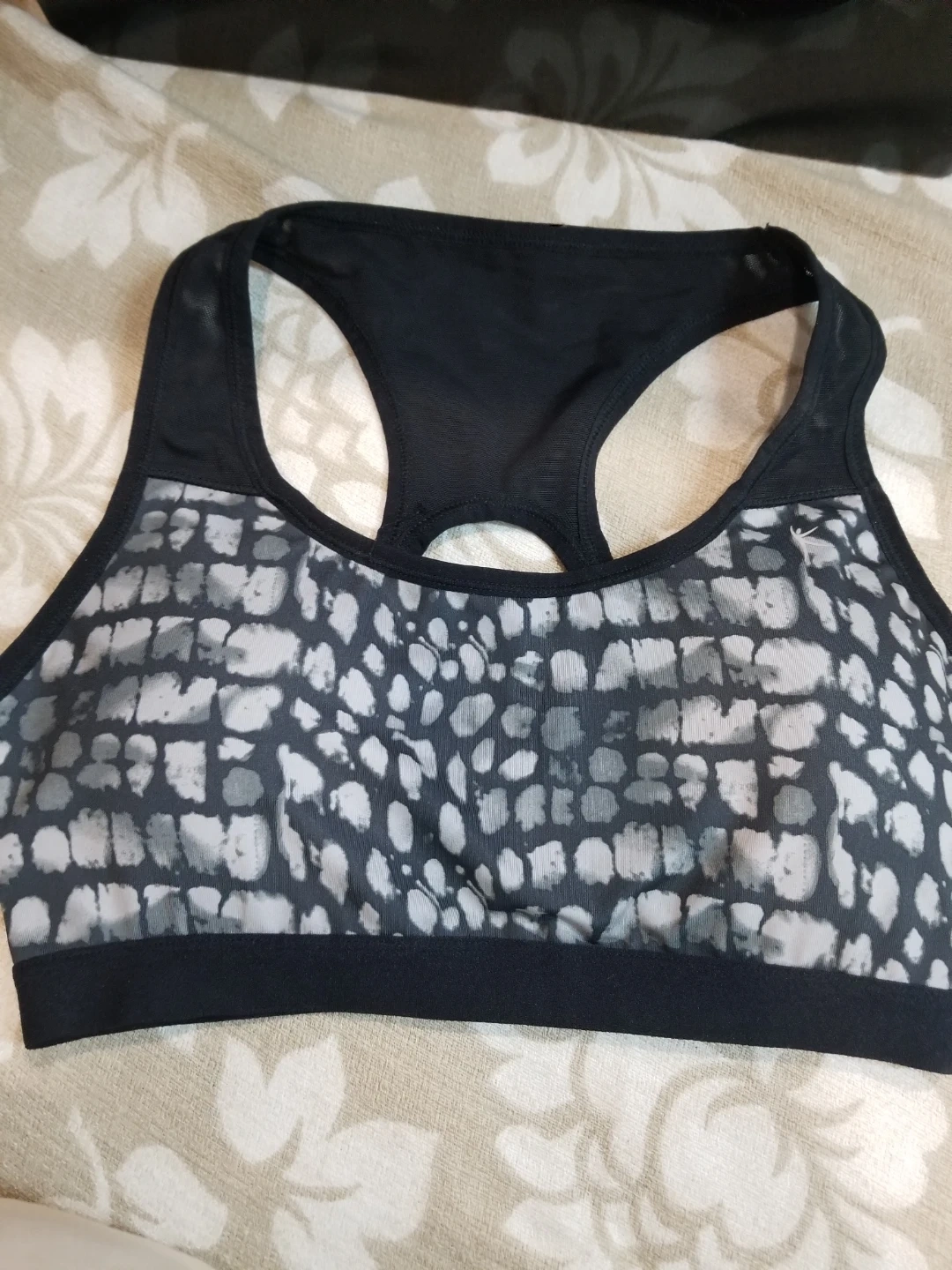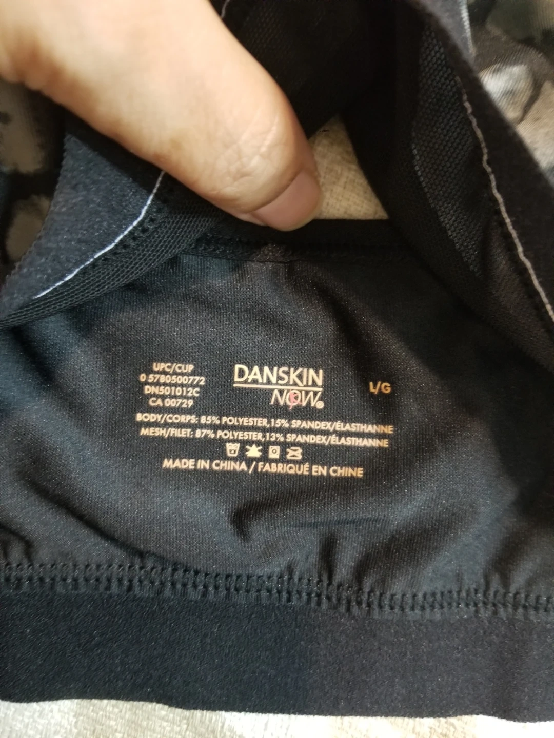 Selling a Danskin Now sports bra in size L. It's made with 85% polyester and 15% spandex for the body, and 87% polyester and 13% spandex for the mesh detailing. Perfect for your workouts!