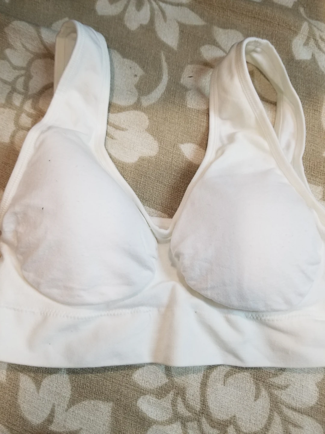 Selling a comfy Genie Bra in white, size large. It's made of 96% nylon and 4% spandex. Easy to care for too, just machine wash cold on a delicate cycle and tumble dry low. Do not iron or bleach .