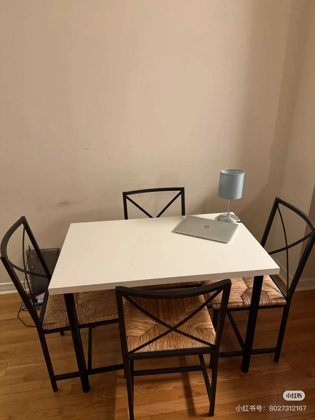 Selling a dining table set that includes a table and four chairs. The table has a white top and the chairs have a woven seat with a black metal frame. It's in great condition and would be a lovely addition to any dining space!