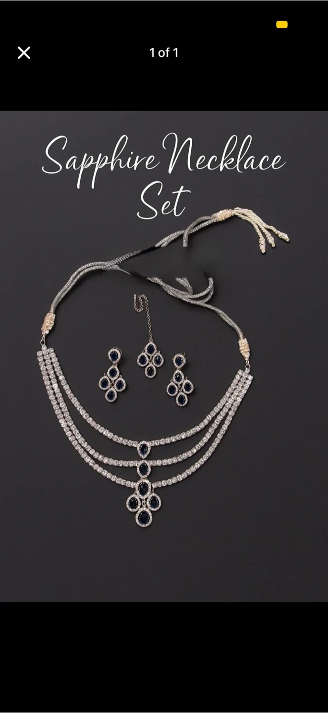 Selling a beautiful sapphire necklace set! This set includes a necklace, earrings, and a headpiece. The stones are a lovely deep blue colour.