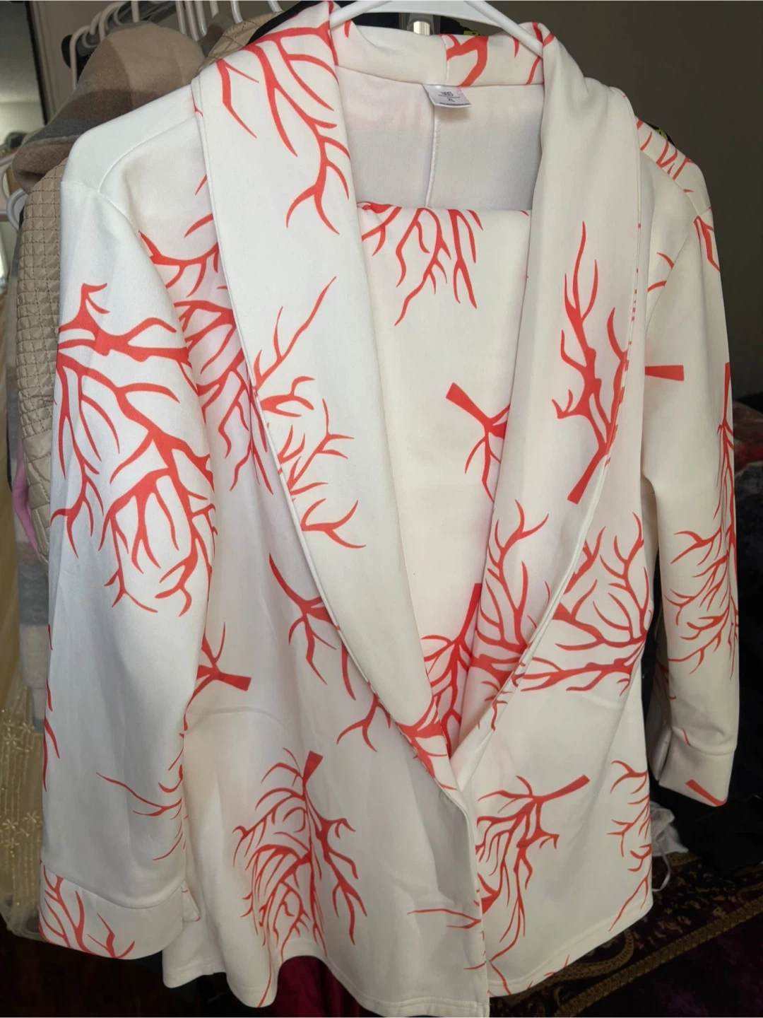 Selling a blazer and pants with a unique red pattern on a white background. It's in great condition and is a size XL. Perfect for adding a pop of colour to your wardrobe!
