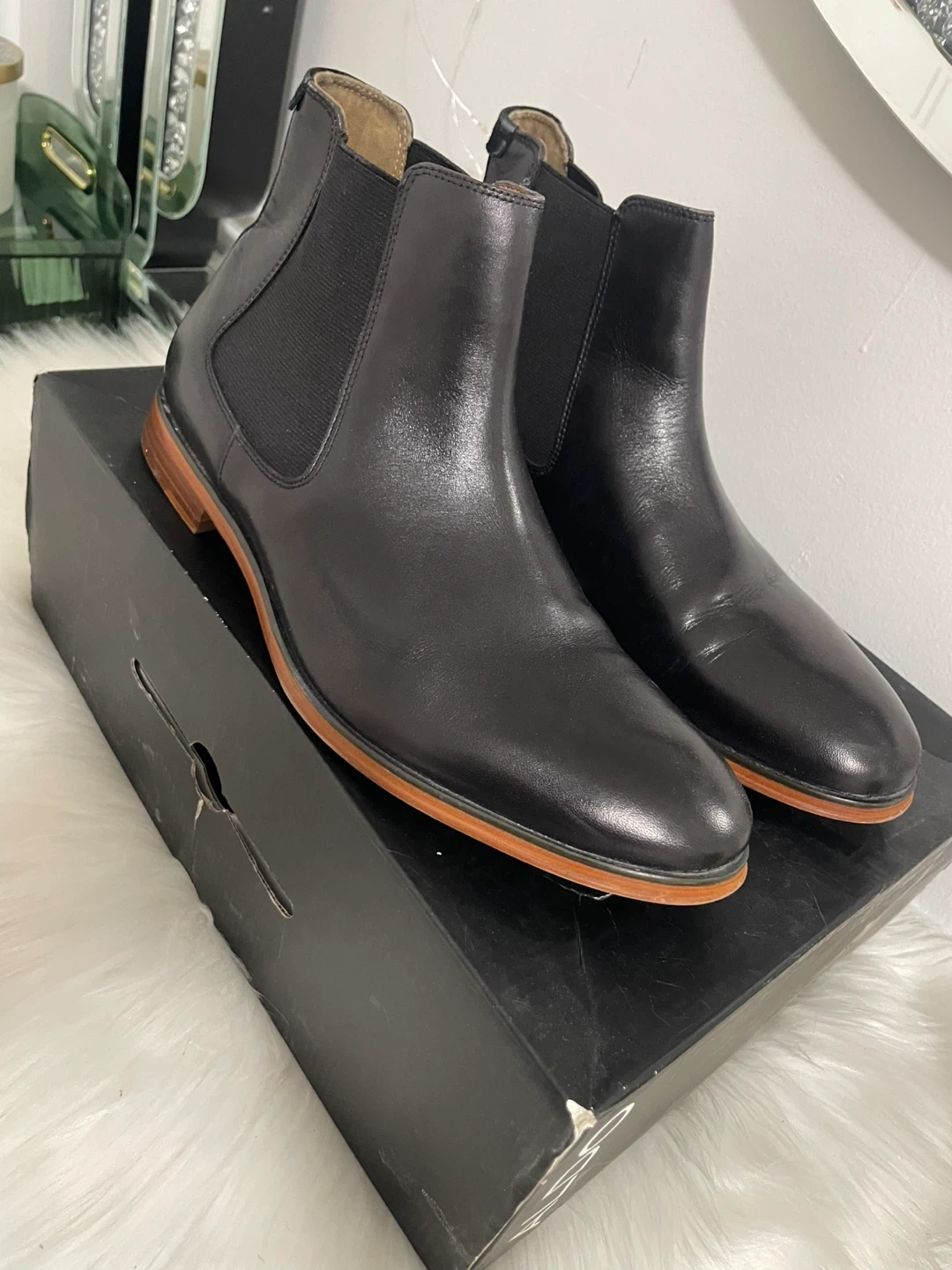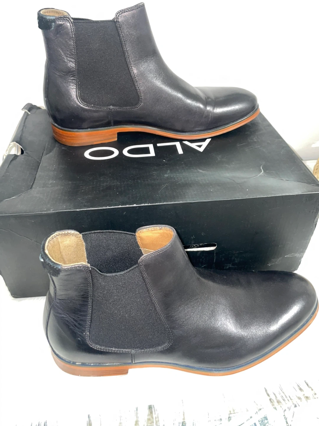Selling a pair of ALDO Chelsea boots in black leather. These boots are in great condition and come with the original box. They're a stylish and comfortable choice for everyday wear!