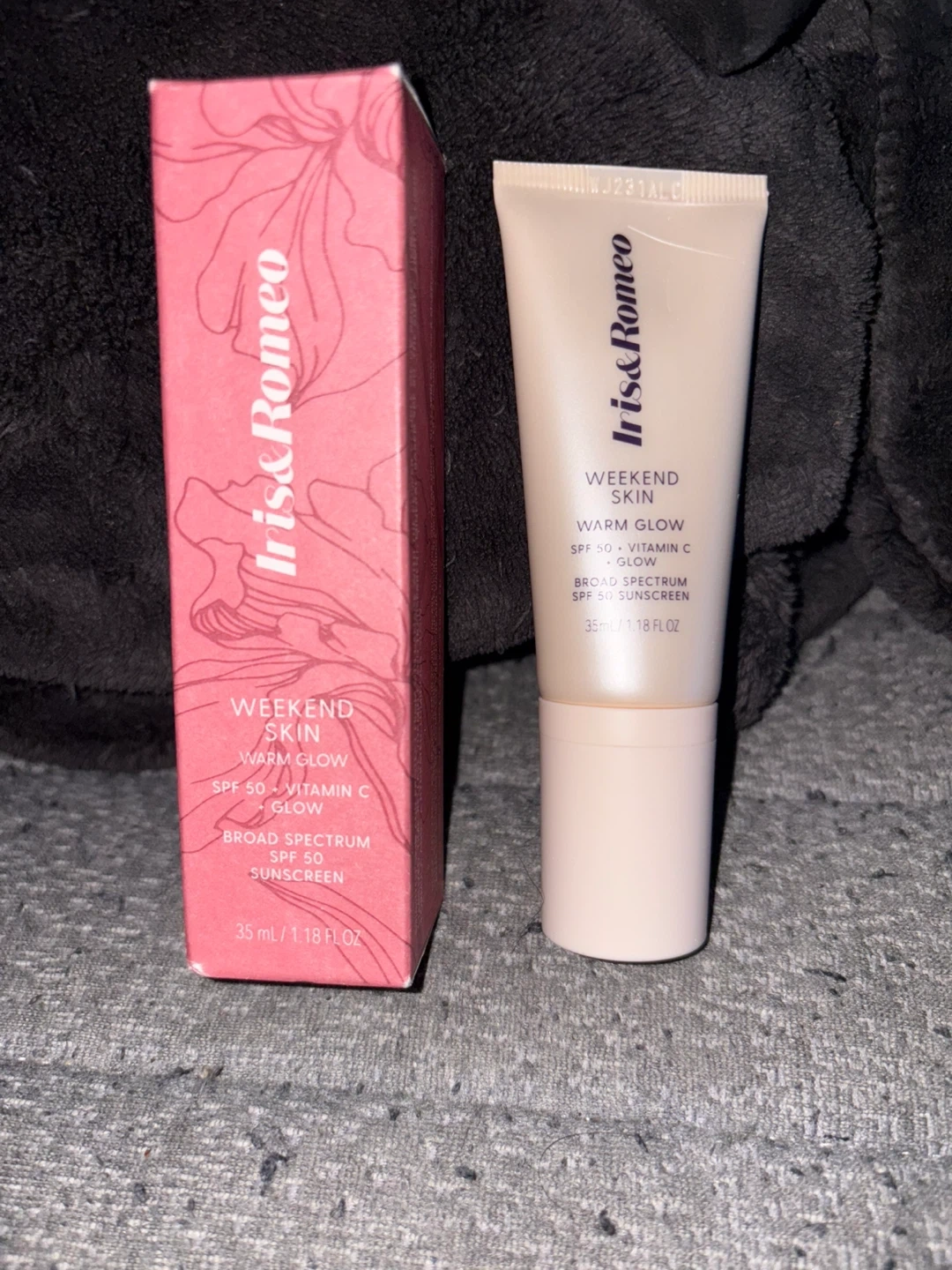Selling a tube of Iris & Romeo Weekend Skin with SPF 50. It's a warm glow, vitamin C glow, broad spectrum sunscreen. It's 35ml / 1.18 fl oz.