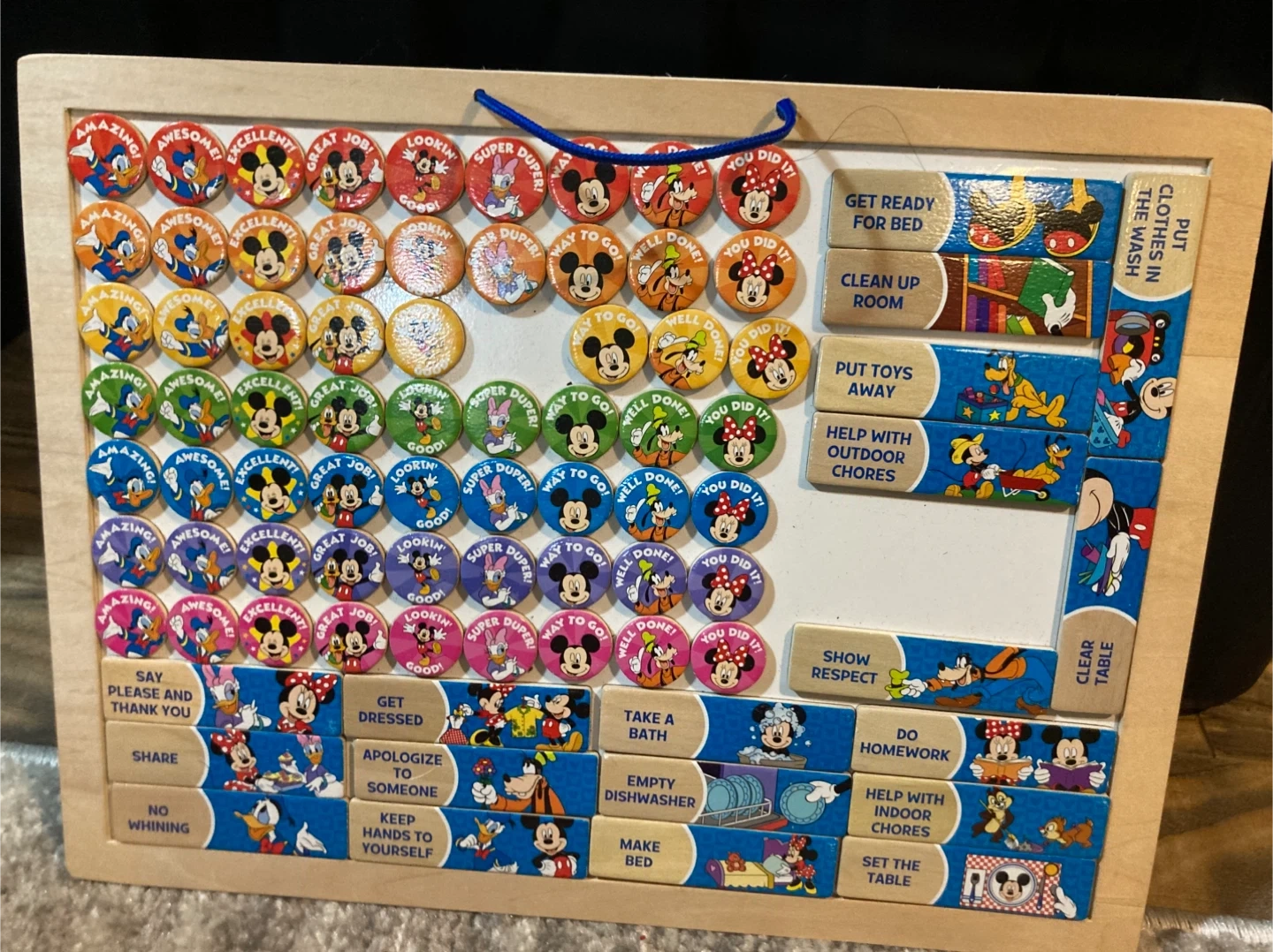 Here's a Melissa & Doug Disney Mickey Mouse Clubhouse Magnetic Responsibility Chart! It's a toddler routine and kids reward board, perfect for ages 3+. Get your little one excited about chores and responsibilities with Mickey and friends.