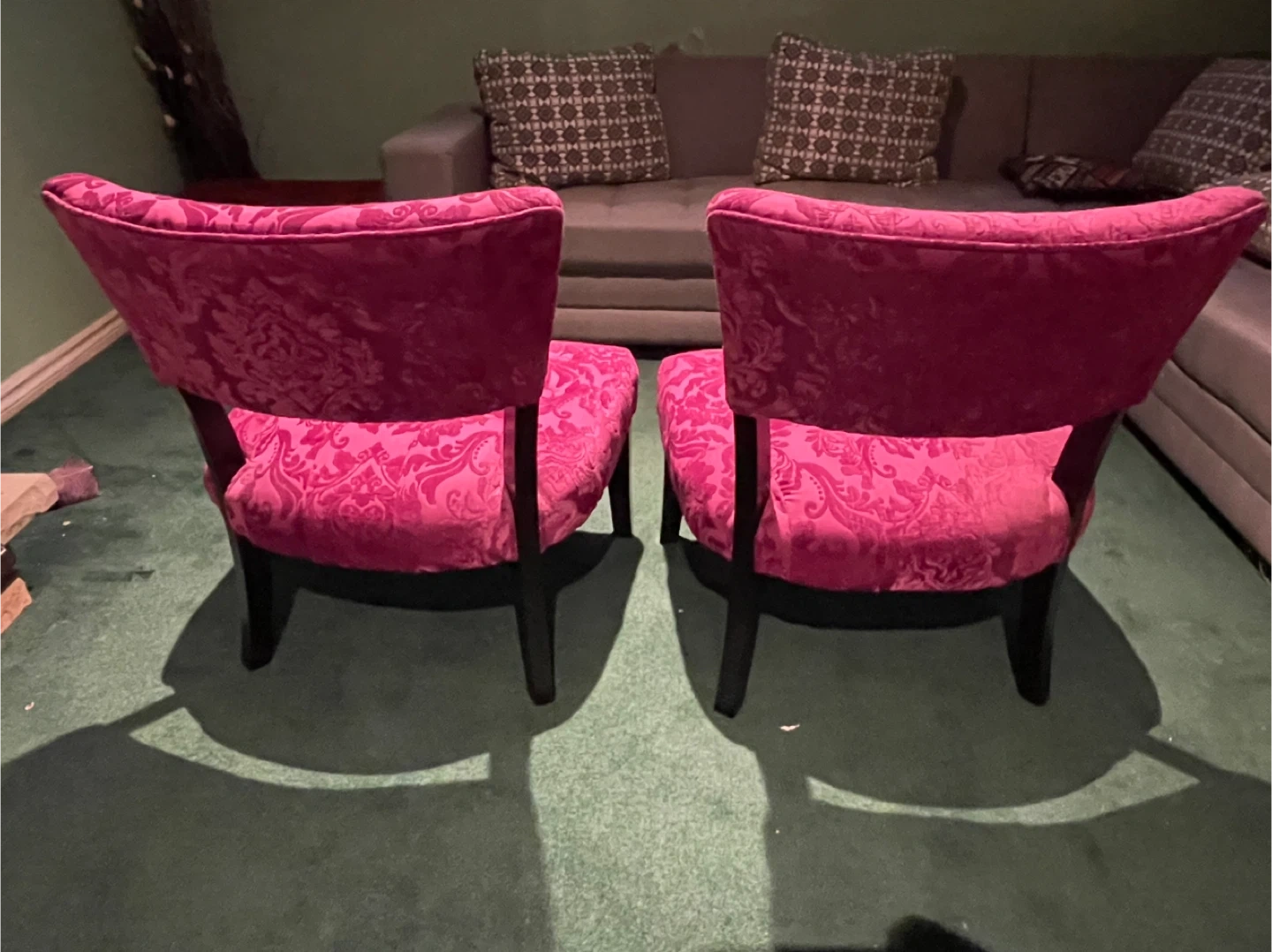 Selling a pair of upholstered accent chairs. They have a lovely pink patterned fabric and dark wood legs. The chairs are in good condition and would be a great addition to any room!