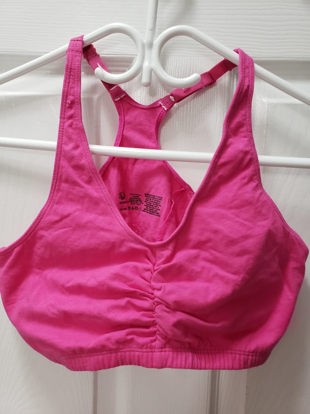 Selling a Fruit of the Loom pink sports bra in size 42. It's made of 95% cotton and 5% spandex. Machine washable in cold water, tumble dry on low.