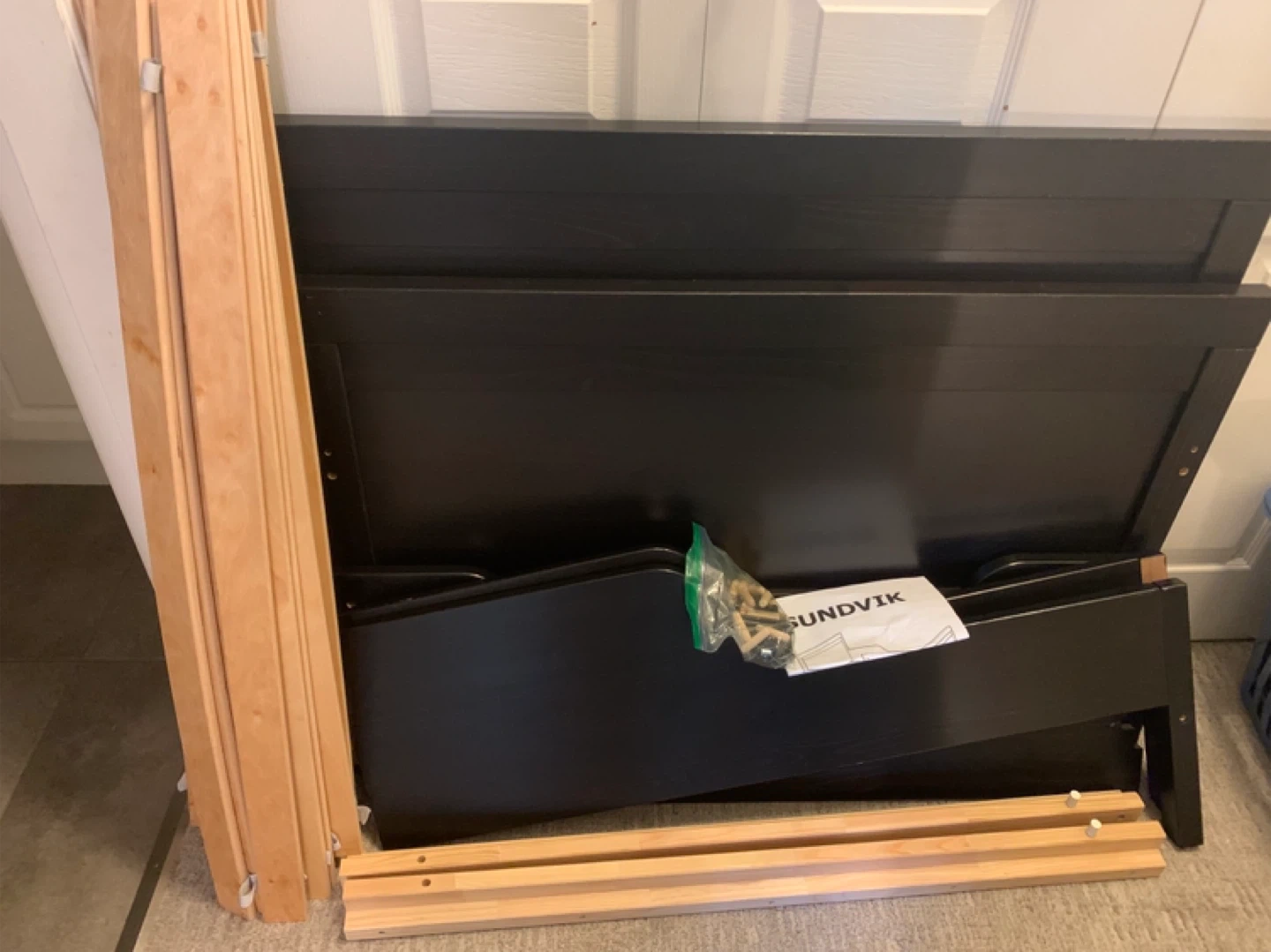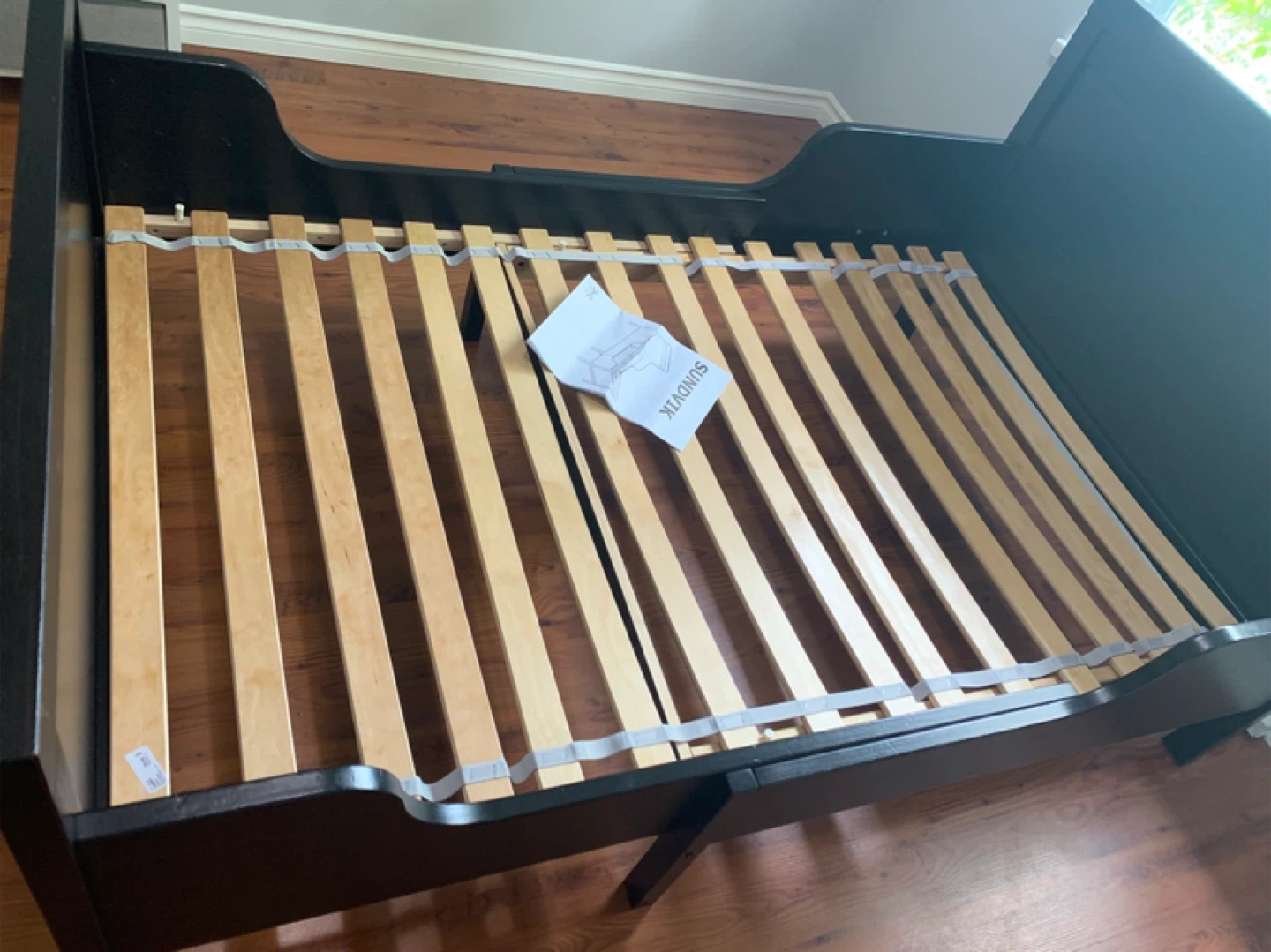 Selling an IKEA Sundvik crib in black-brown. It's in good condition and comes with all the necessary parts and slats. Assembly instructions are also included!