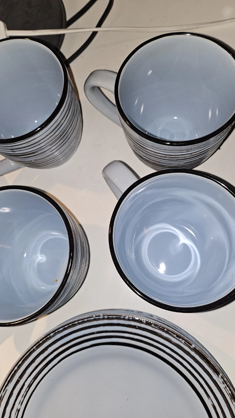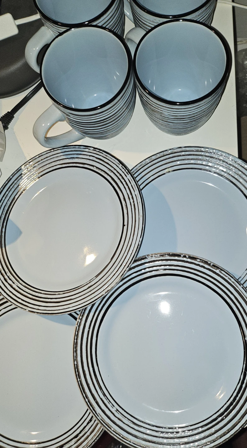 12-piece Stokes Birch Sky tableware set! The set includes plates and mugs with a stylish black and white striped design. There are no chips or scratches.