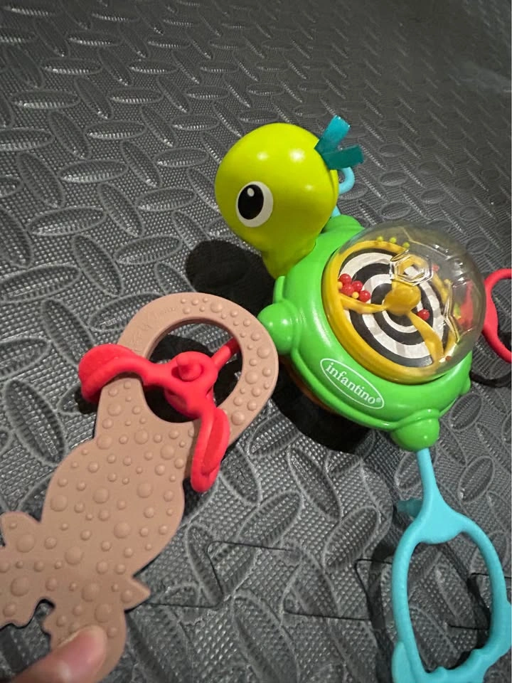 Holds 4 toys with handles clasps for baby to play with and keep busy.