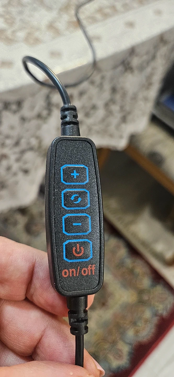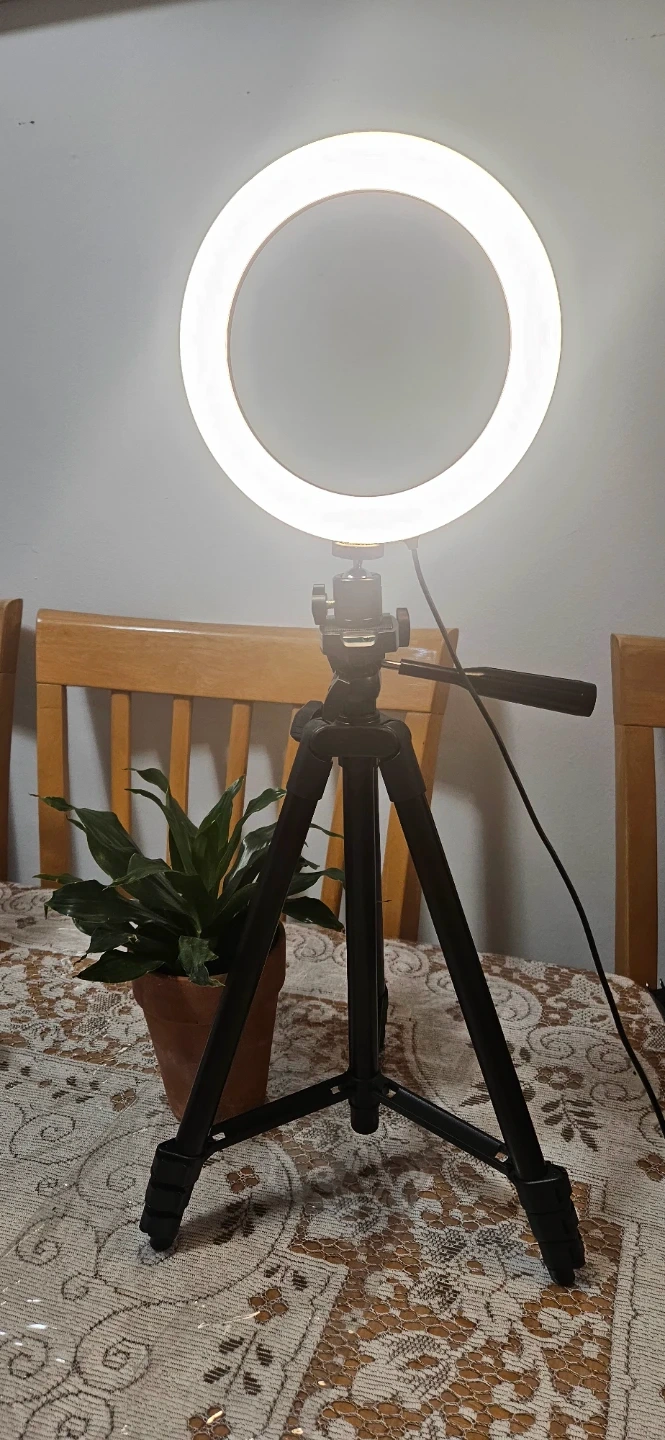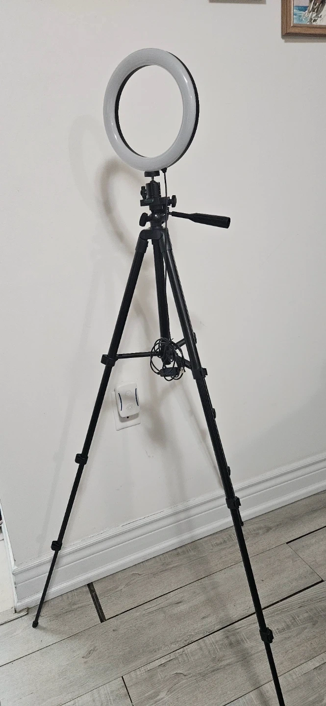 Selling a ring light with a tripod stand. It comes with an on/off switch and brightness controls. Great for video calls or content creation!