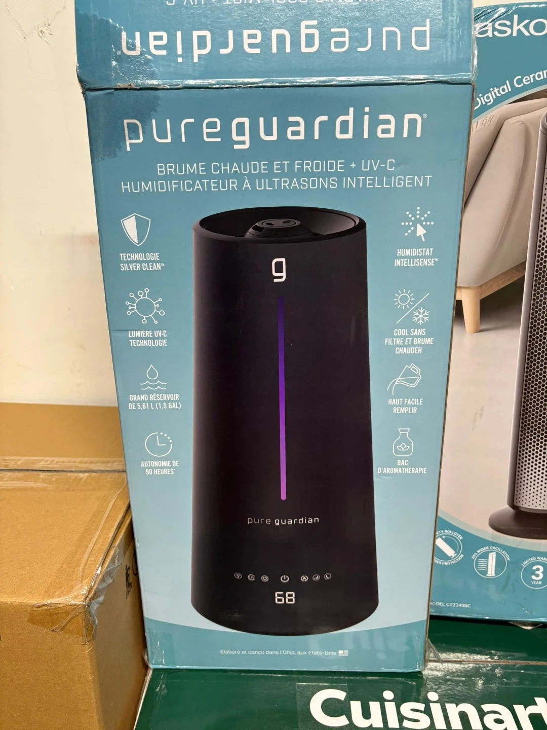 Selling a PureGuardian Ultrasonic Smart Humidifier. It features warm and cool mist, plus UV-C technology. It has a 5.61 L (1.5 gal) tank, and can run for up to 90 hours. It also has a aromatherapy tray