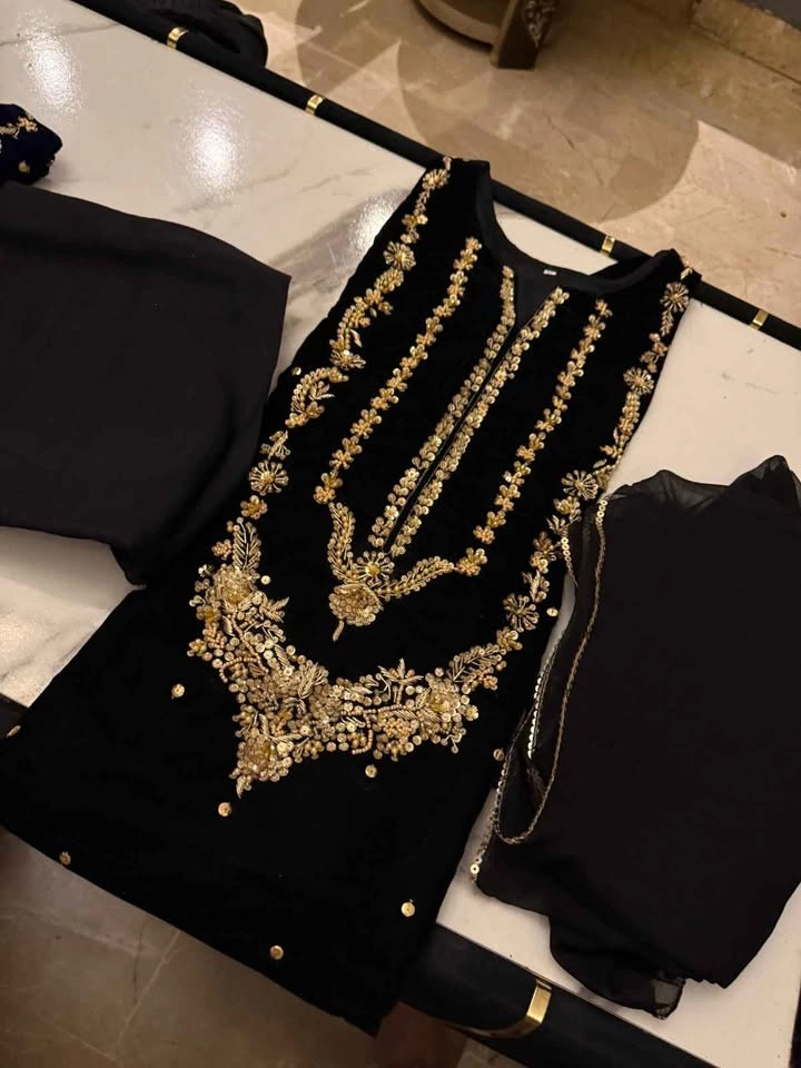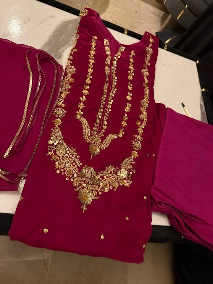 Pre booking start now 9000 microvelvet pure handwork dresses Chiffon dopatta Rawsilk trousers Size S M L xl available 45 length 5 colors blue zinc maroon black and Hotpink Price $120 Like, Share and Follow us on Facebook https://www.facebook.com/share/16gFtp8idp/?mibextid=wwXIfr