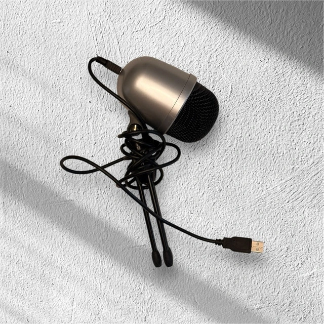 Amazon Basics condenser microphone in silver colour. I upgraded to a more expensive model. Works well for video calls, podcasting, etc.