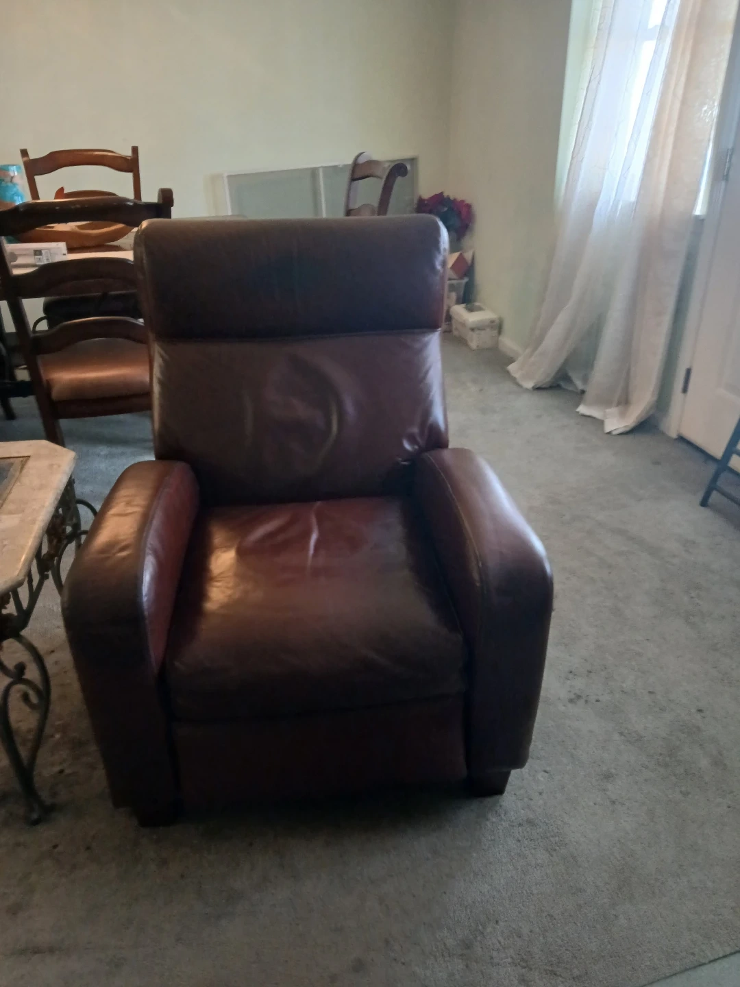 Selling a comfortable brown leather recliner chair. It's in good condition and perfect for relaxing after a long day! The recliner is a great addition to any living room or den