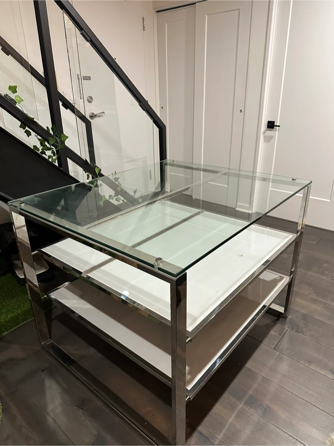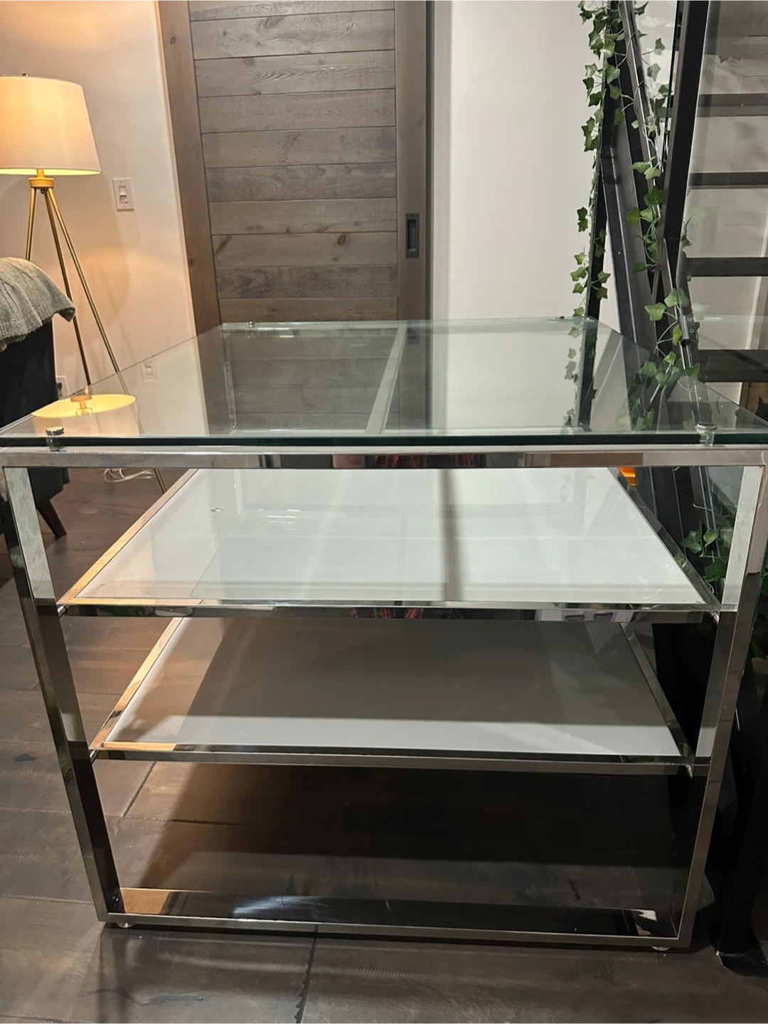 Modern, high-quality display table. Sleek tempered glass top, two glossy white lower shelves, and a sturdy chrome frame give it a clean, contemporary look. Perfect as a console, display, or entryway table in a home, office, or boutique.