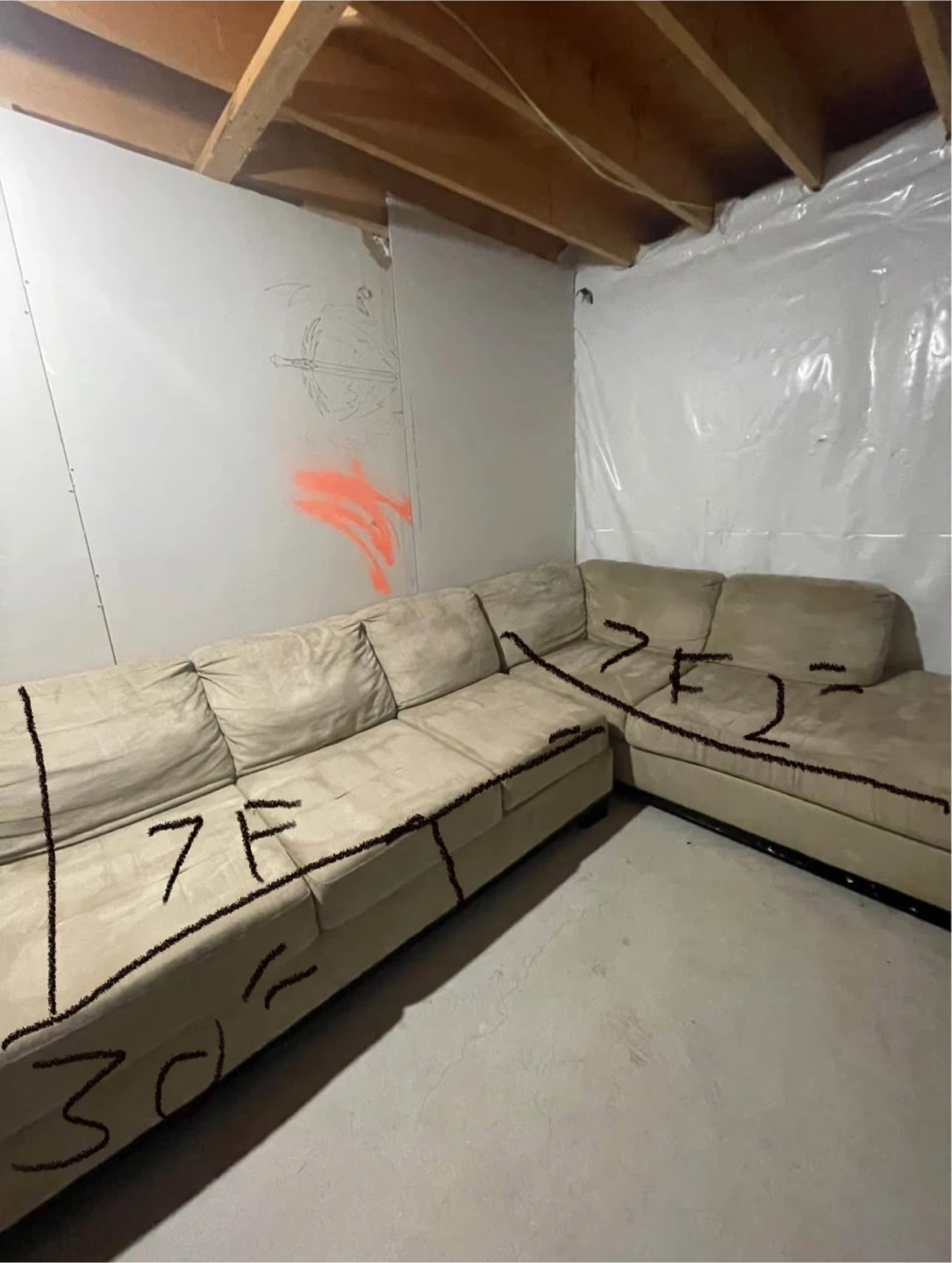 Selling a beige L shape splittable sofa. It measures approximately 7 feet by 7 feet. It's in used condition, perfect for a living room or basement space