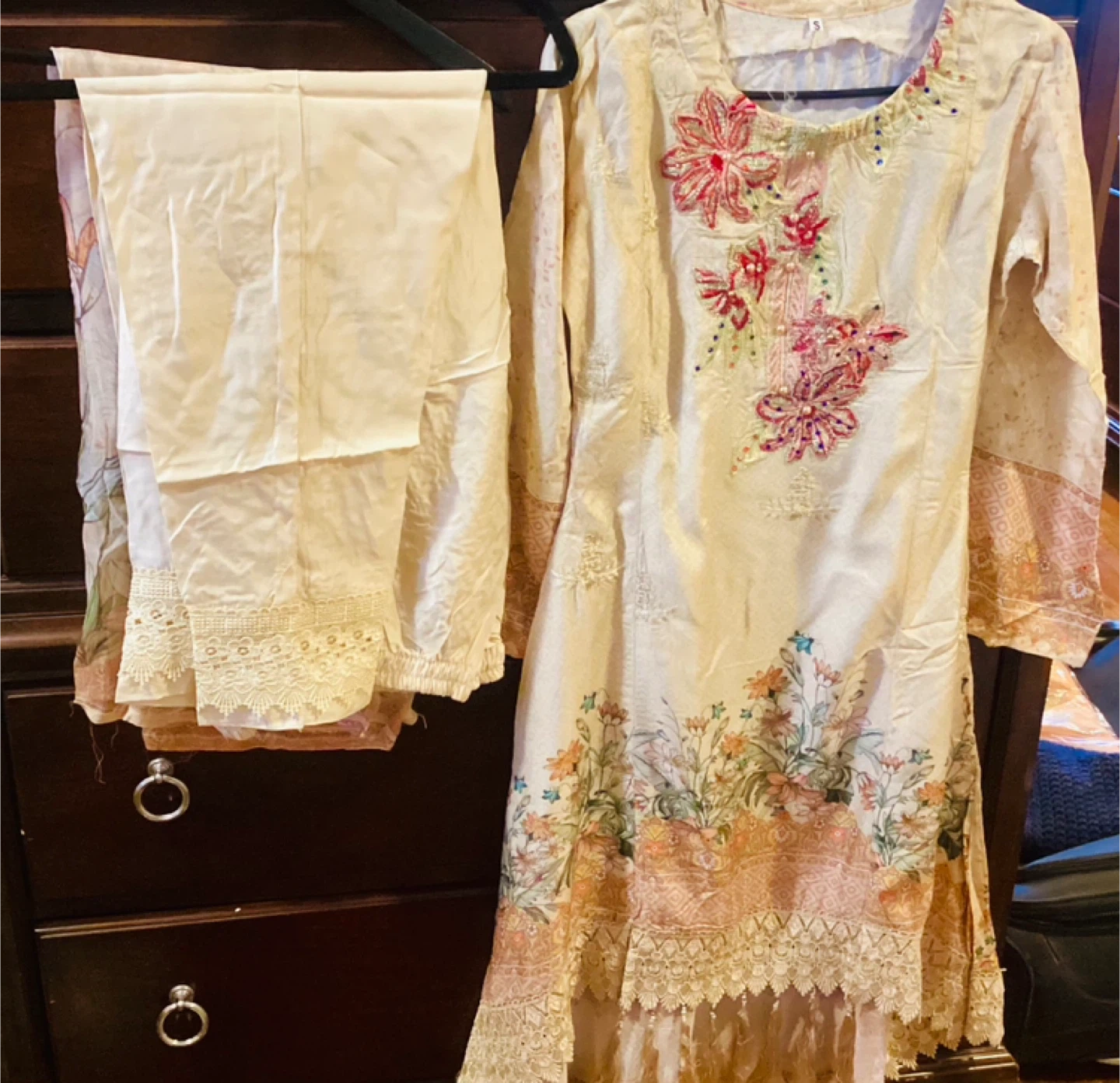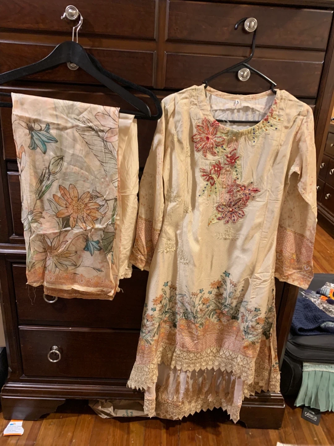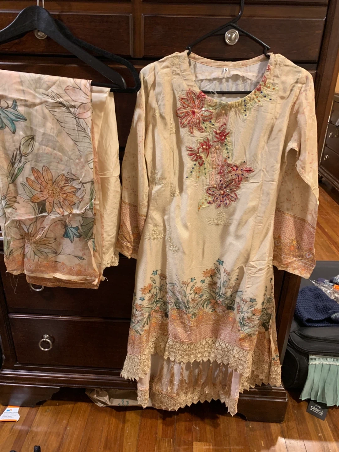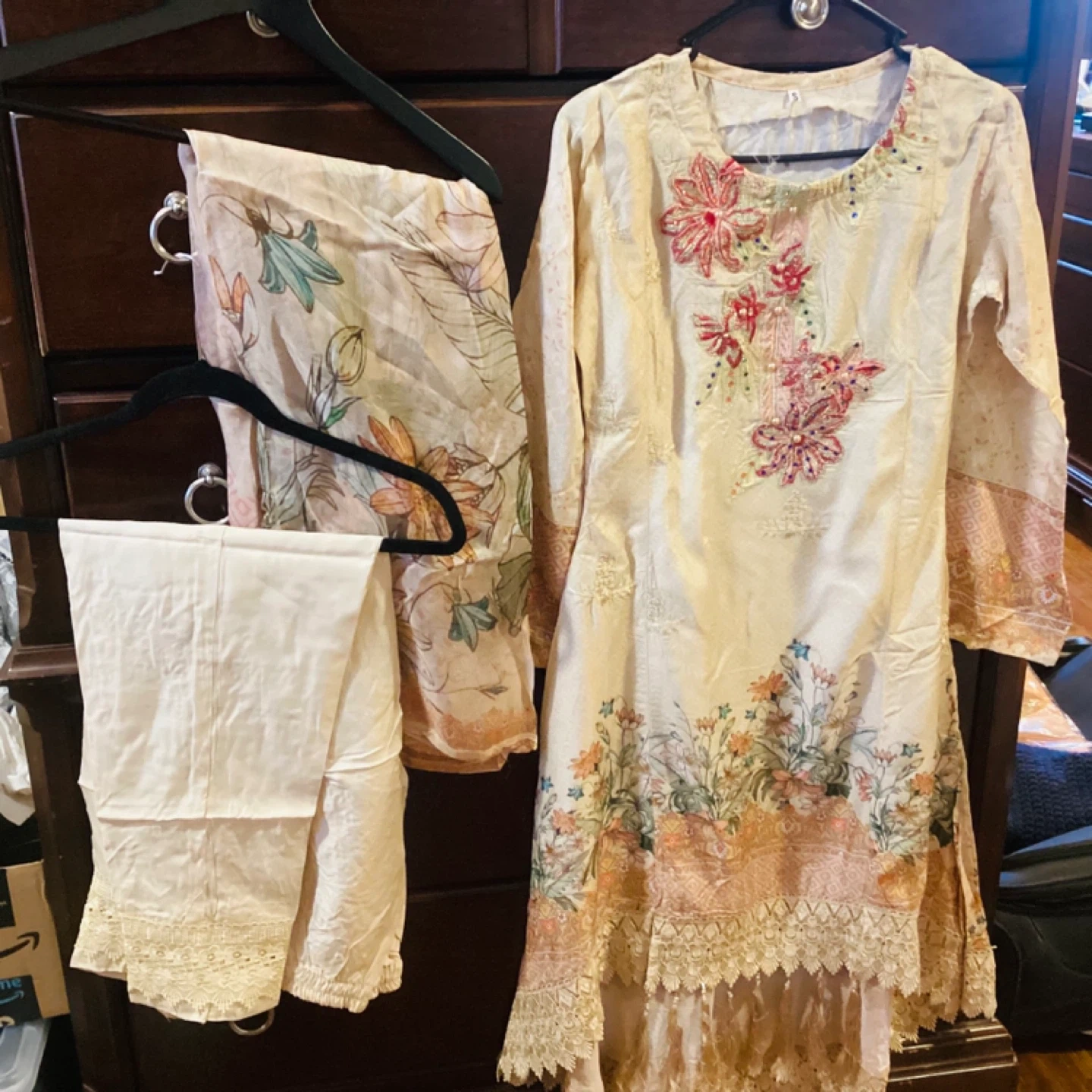 Selling a beautiful salwar kameez suit set with floral embroidery. The set includes a tunic top, pants, and a matching scarf. The fabric has a lovely sheen and the embroidery adds a touch of elegance. Perfect for special occasions or everyday wear!