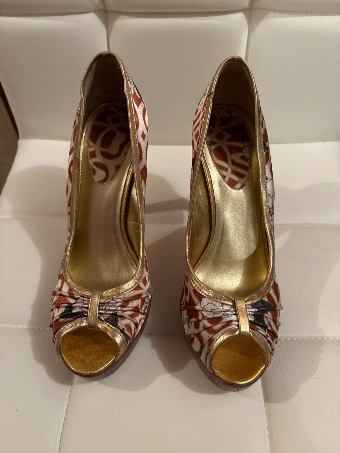Selling a pair of open toe heels in size 8. They have a unique pattern and gold accents. Perfect for adding a touch of elegance to any outfit!