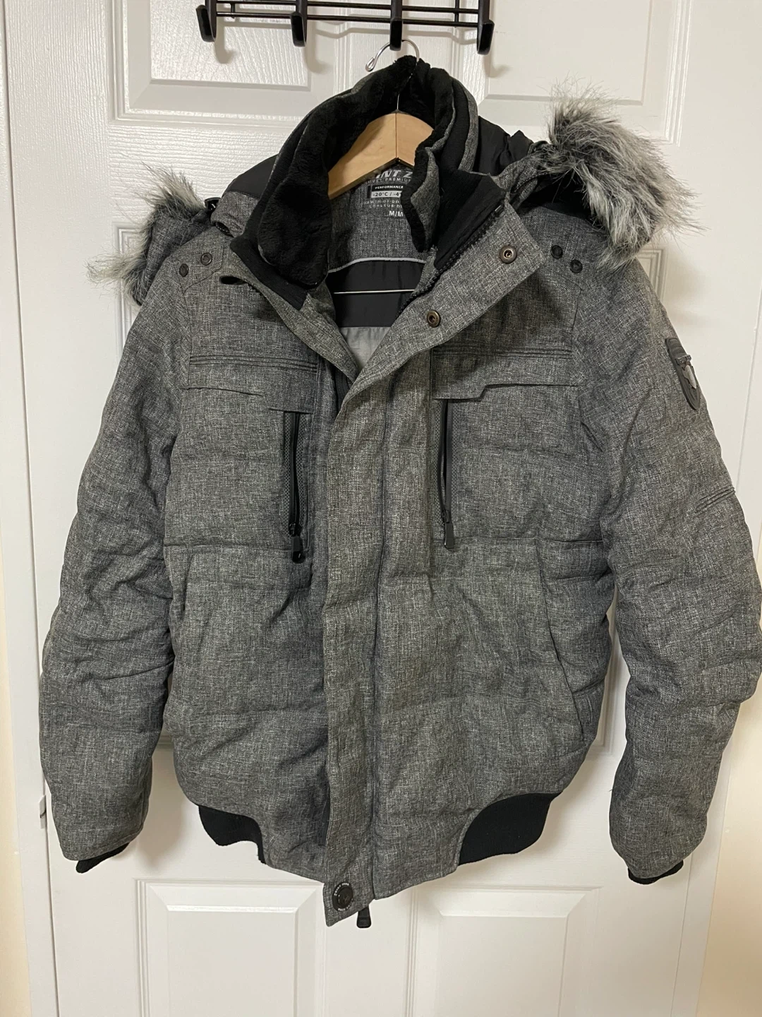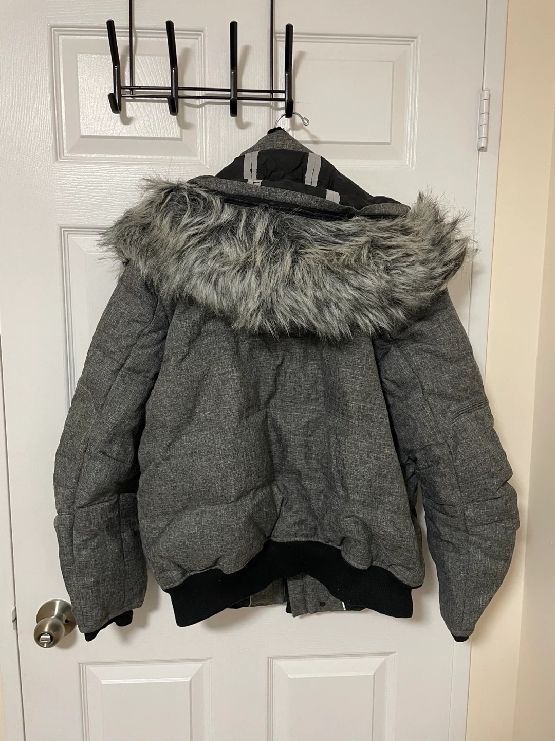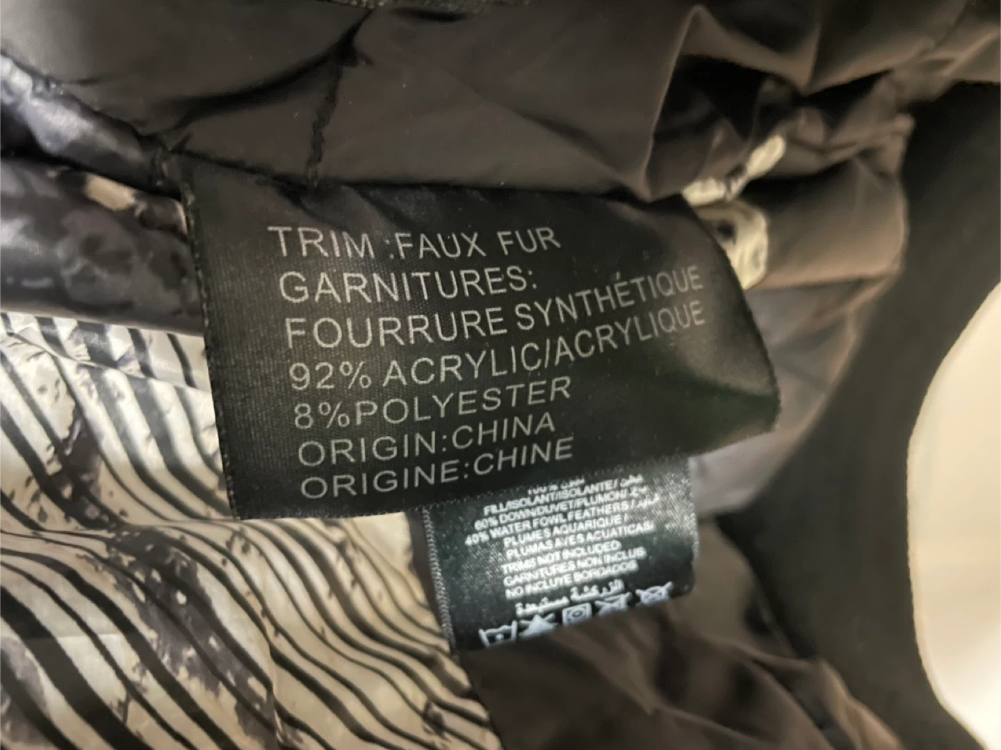 The trim is faux fur, made of 92% acrylic and 8% polyester.