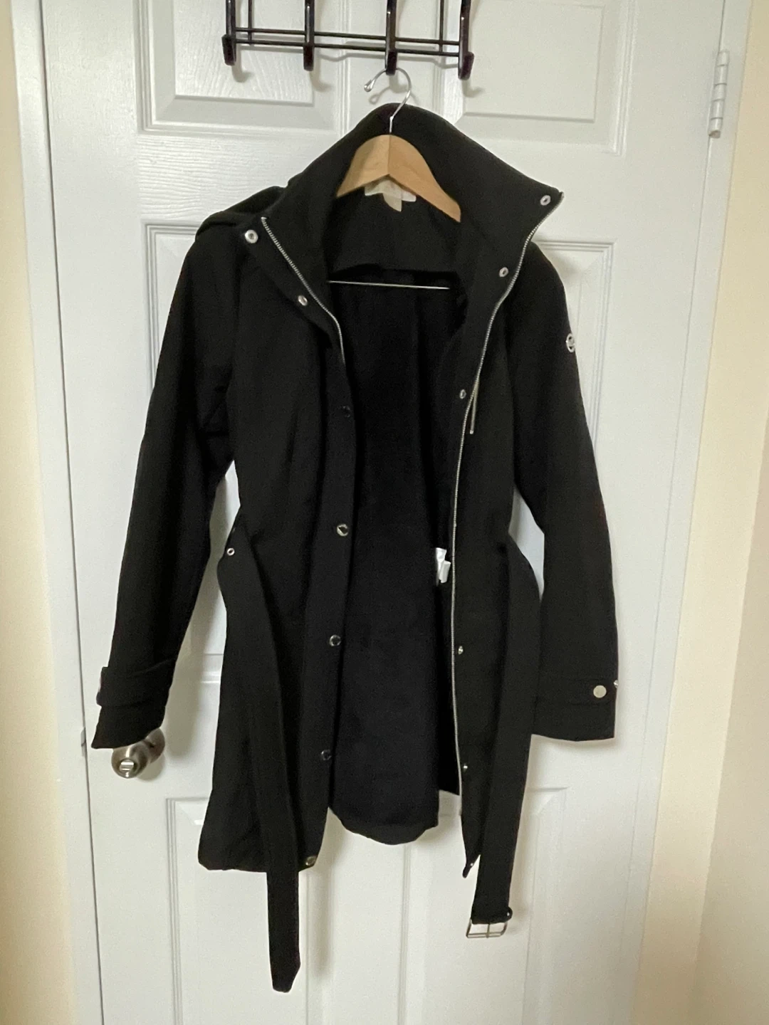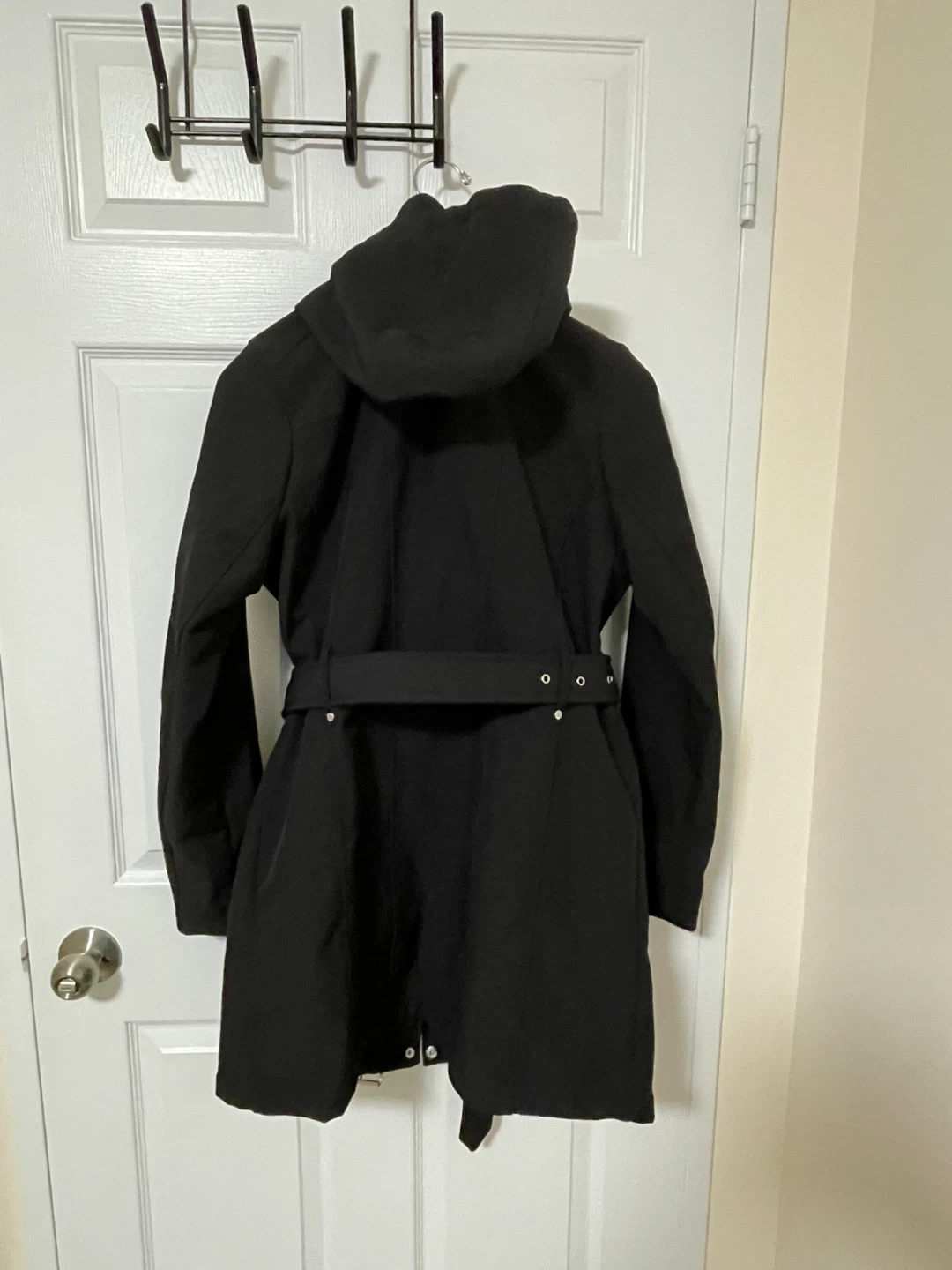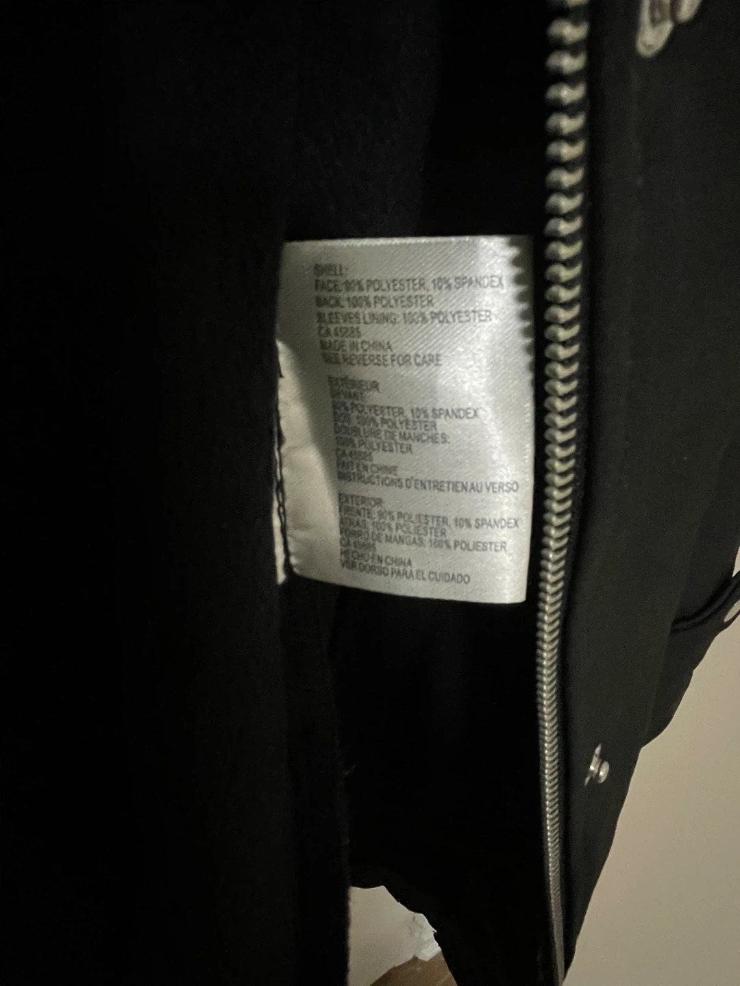 The shell is made of 90% polyester and 10% spandex, while the back and sleeves lining are 100% polyester. It's a size M/M.