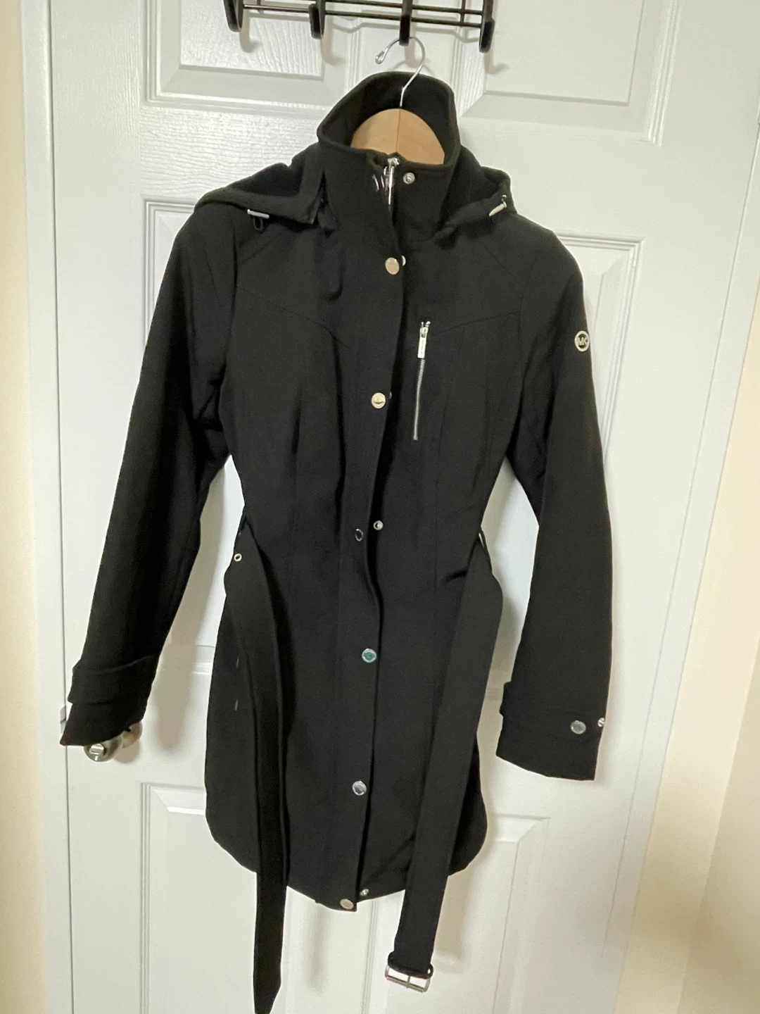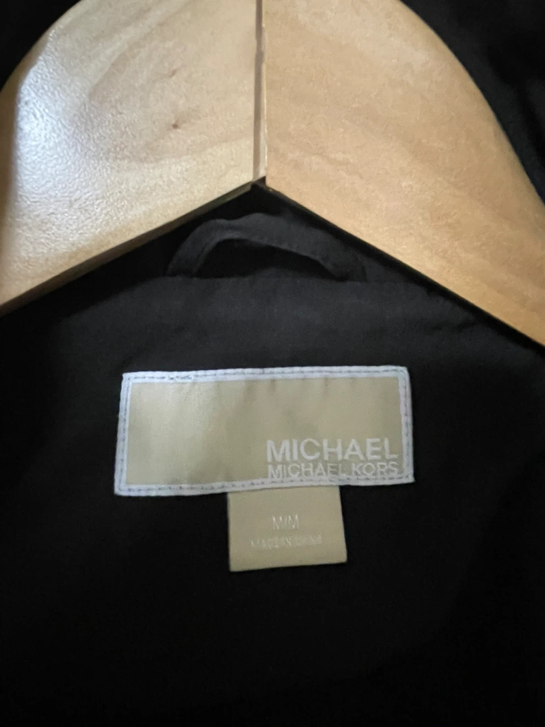 The shell is made of 90% polyester and 10% spandex, while the back and sleeves lining are 100% polyester. It's a size M/M.