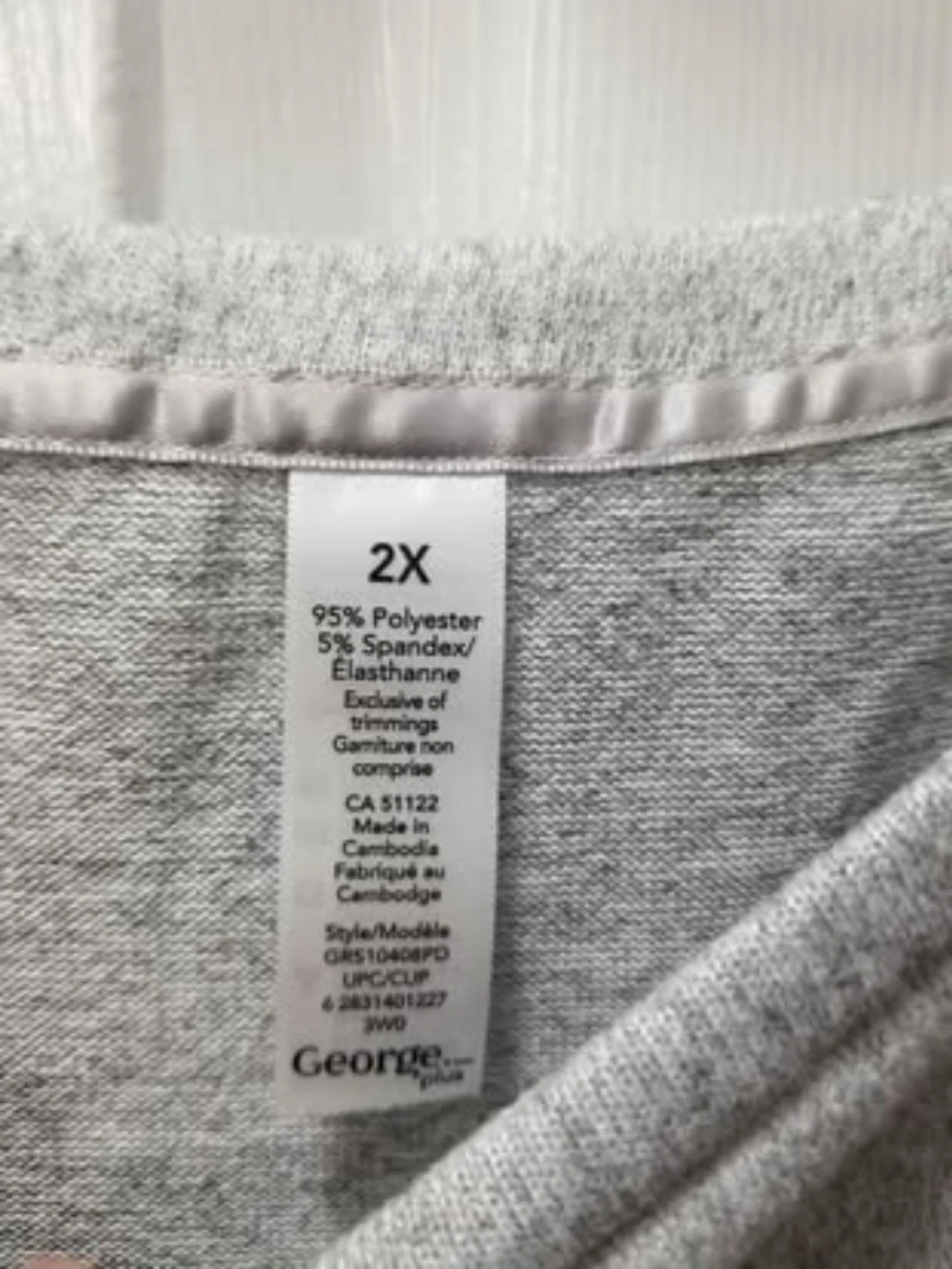 This is a George Plus size 2X top in a lovely grey colour. It's made of 95% polyester and 5% spandex, making it super comfy! The style/model number is GRS10408PD. No tag