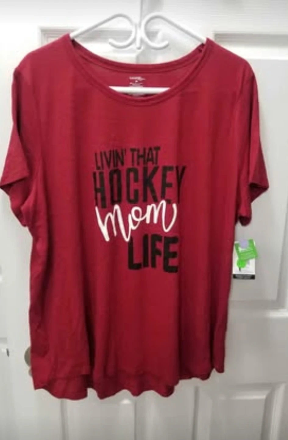 Burgundy T-shirt with 'Livin' That Hockey Mom Life' printed on the front! Perfect for showing your support at the rink or just for everyday wear.