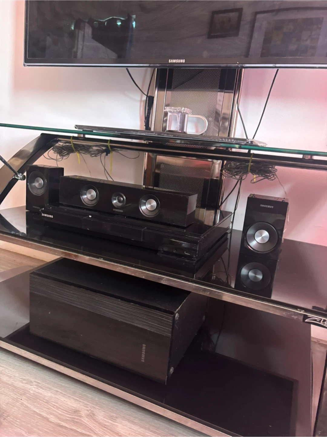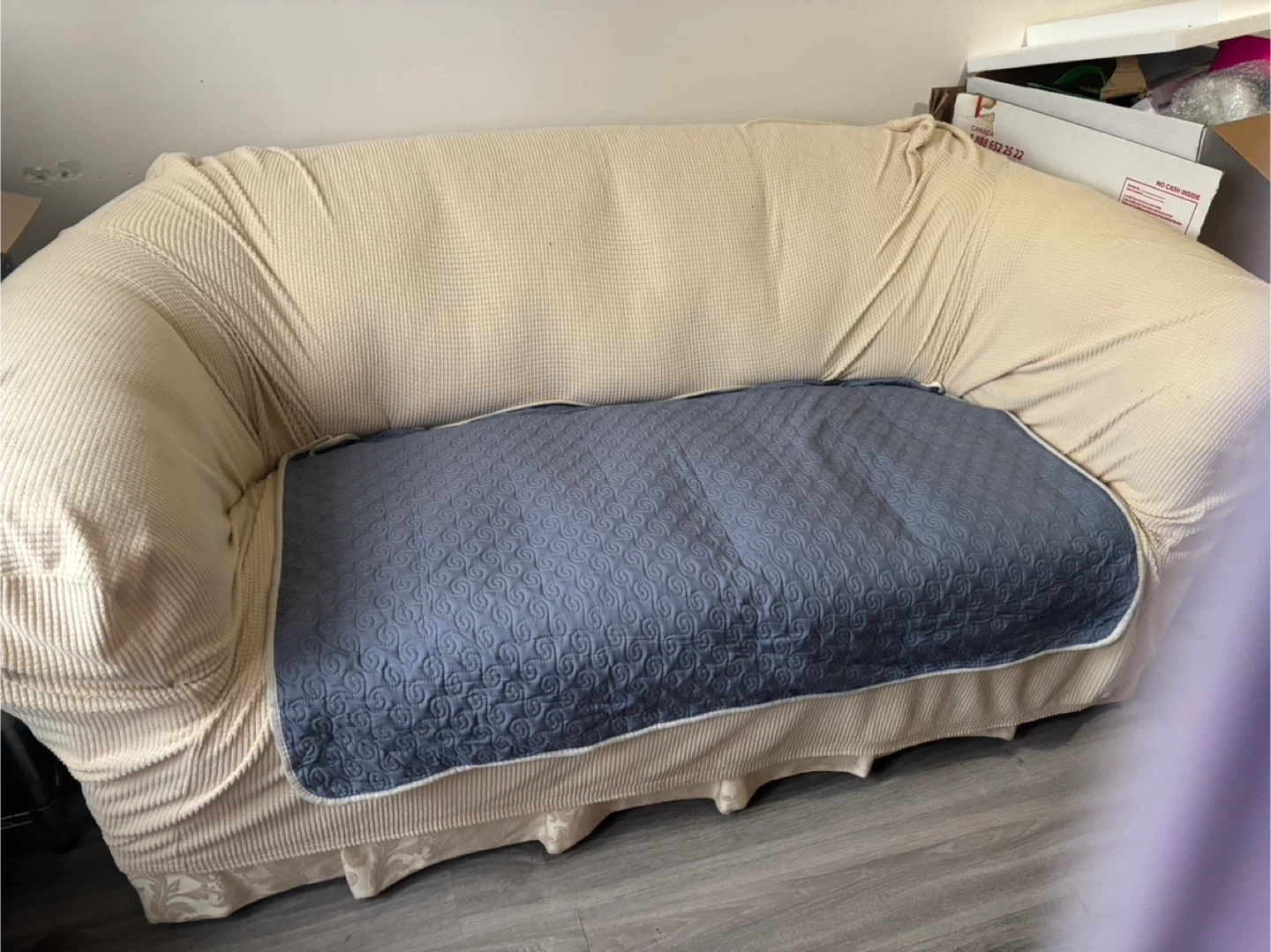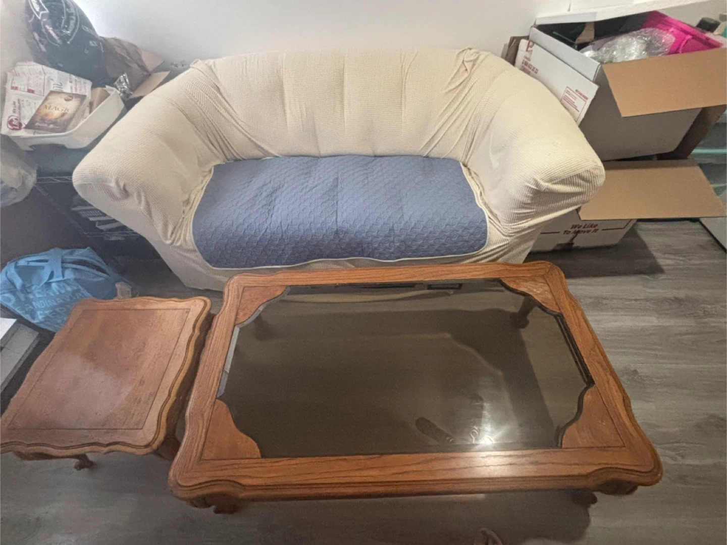 Selling a living room set that includes a sofa, a coffee table with a glass top, and an end table. The sofa is covered with a patterned, off-white fabric. The coffee table and end table have a wooden frame with a classic design. Perfect for furnishing a living space!