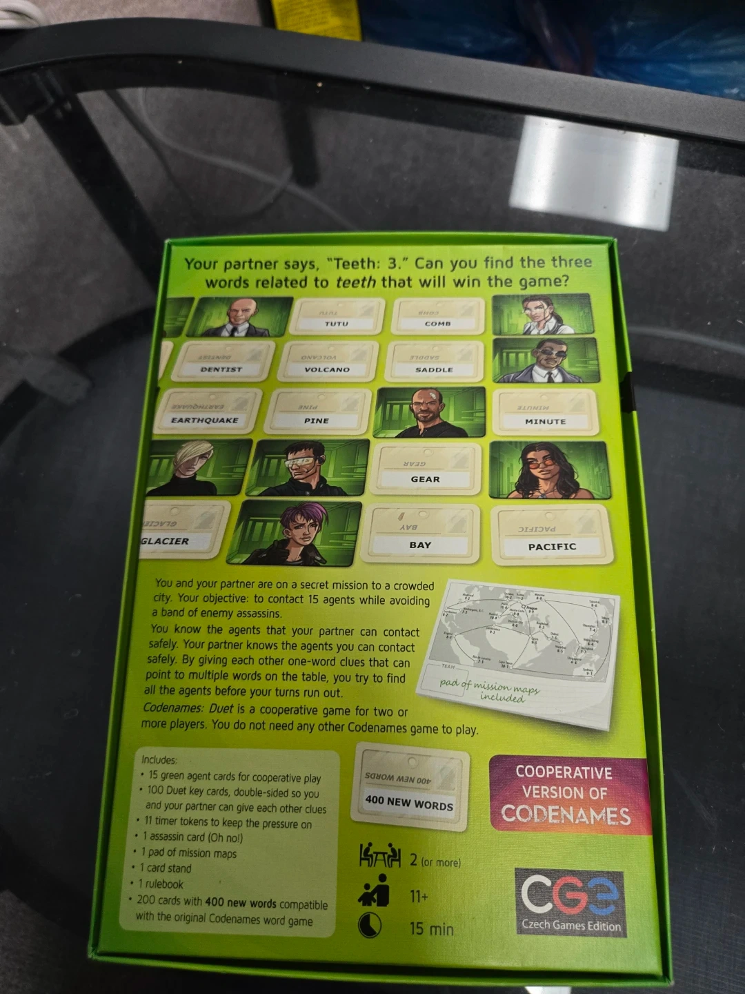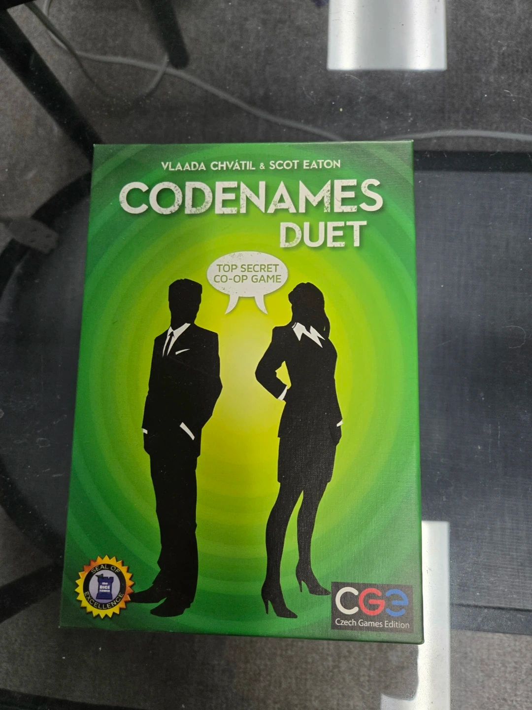 Selling a cooperative version of Codenames: Codenames Duet! It's a fun game for two or more players where you and your partner are on a secret mission in a crowded city. You'll try to contact 15 agents while avoiding a band of enemy assassins.