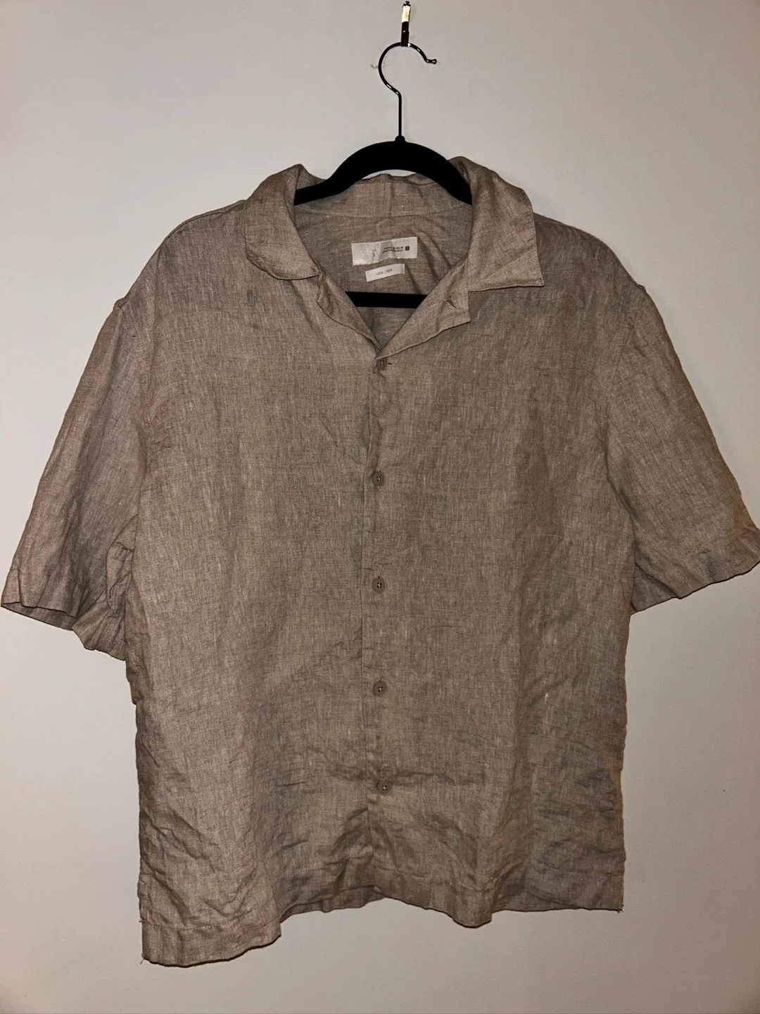 17Here's a gently used men's short-sleeve shirt made of linen. It's a great casual piece for warmer weather! The neutral colour makes it easy to pair with anything