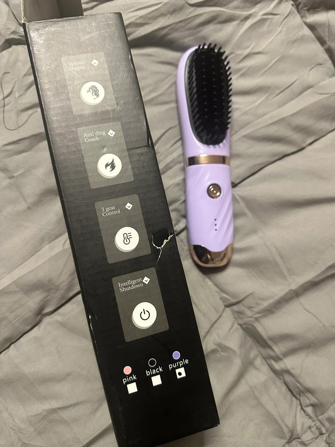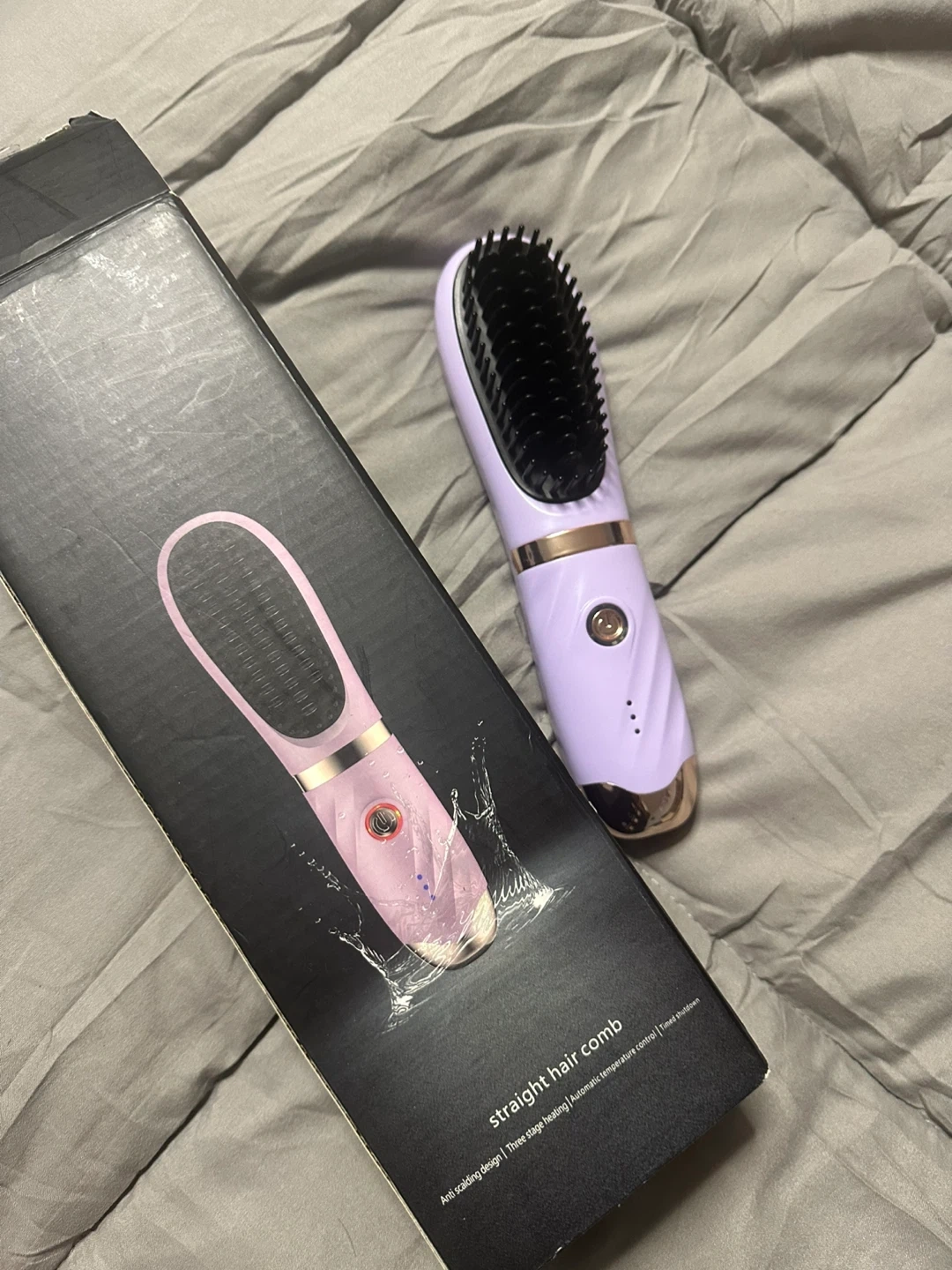 Straight hair comb in purple! It has an anti-scalding design and three-stage heating with intelligent temperature control, plus timed shutdown. It also has an anti-ding comb to create various shapes. Comes with the box