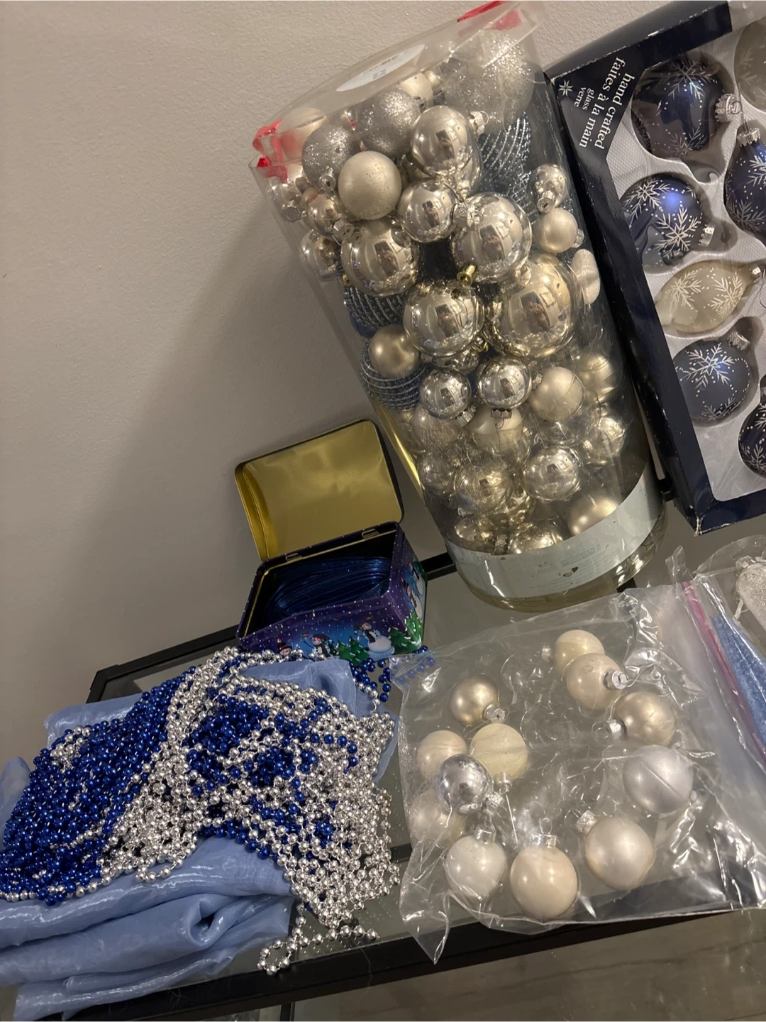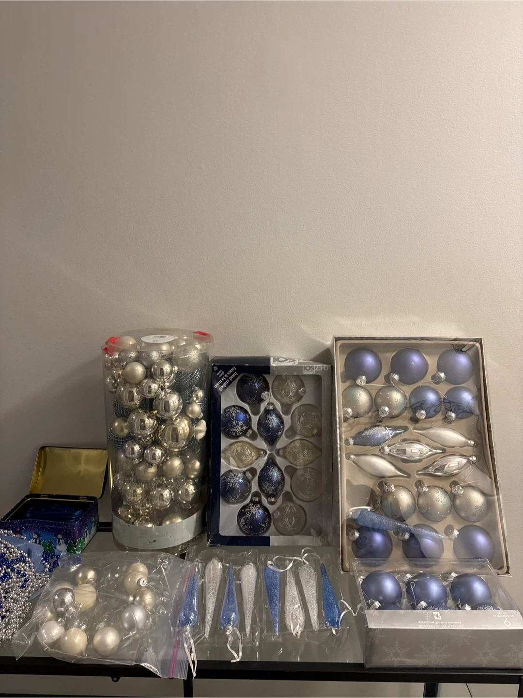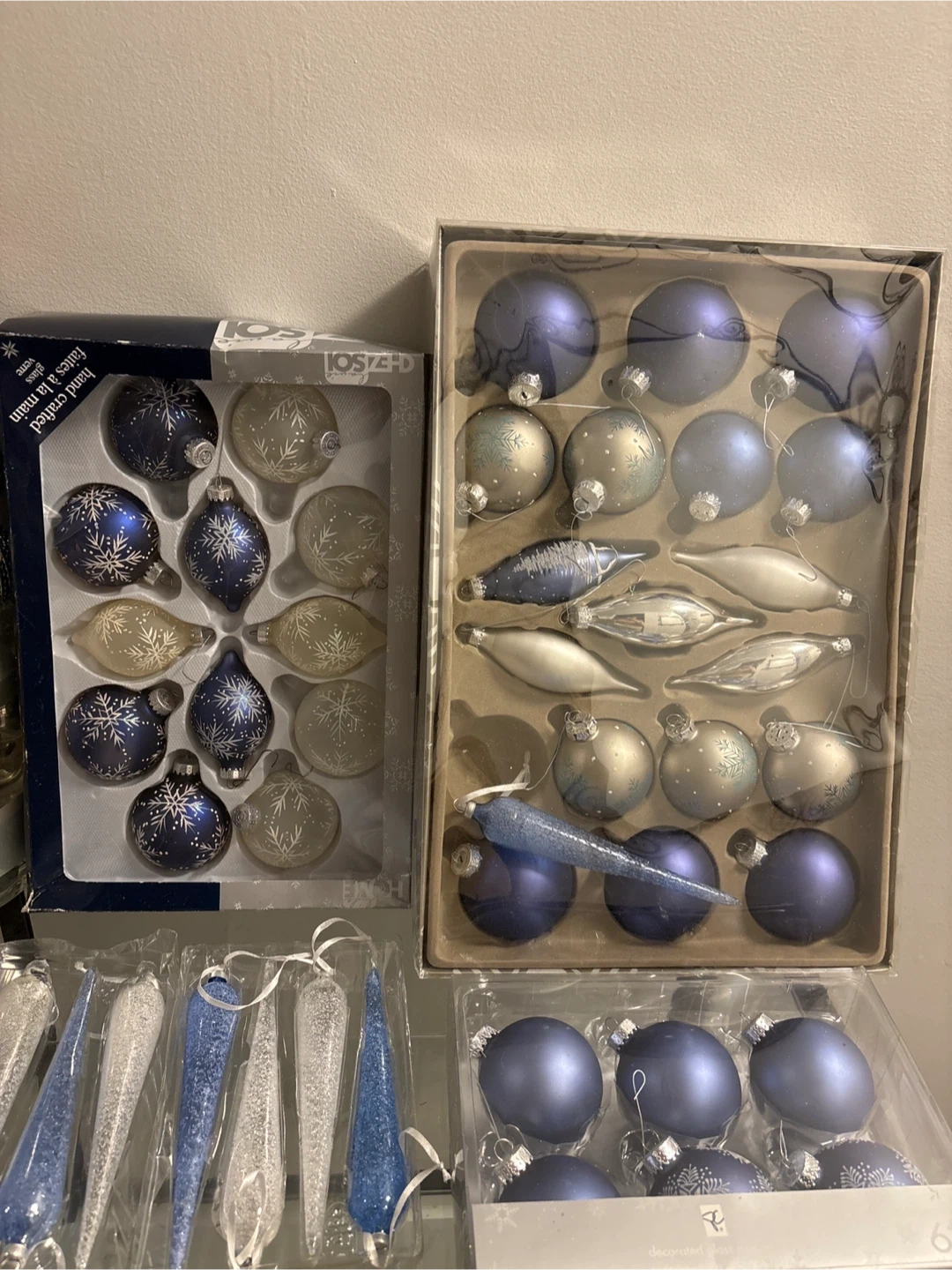 Selling a collection of blue and silver Christmas ornaments! Includes a variety of shapes and sizes, perfect for decorating your tree or home this holiday season