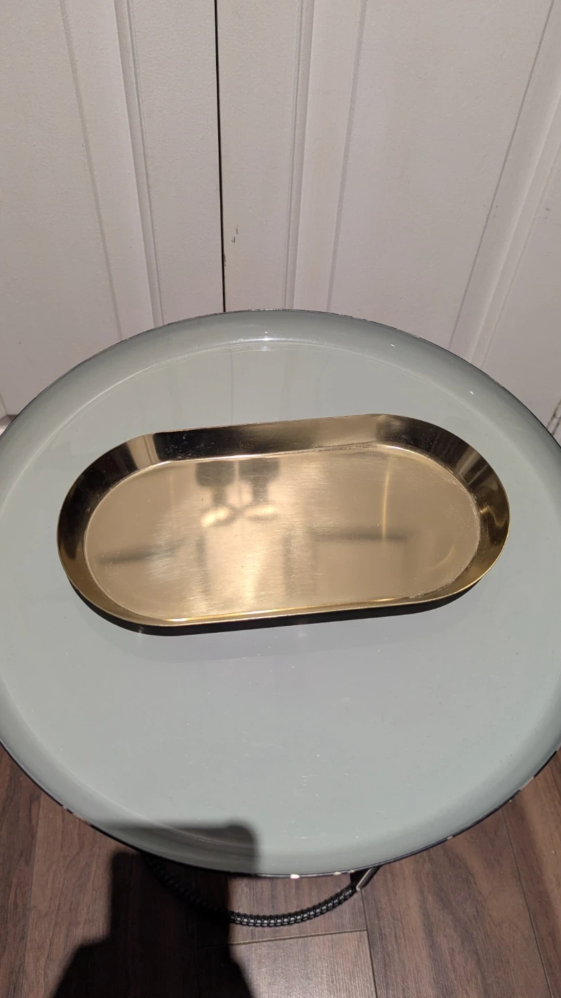 Selling a gold coloured decorative tray. It's in great condition and would be perfect for adding a touch of elegance to any room.