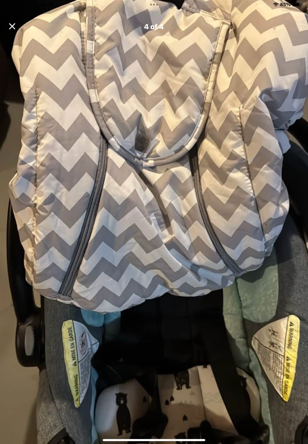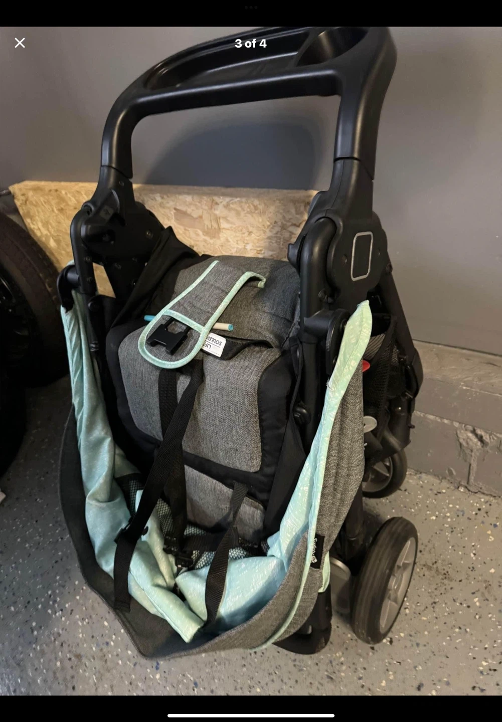 Selling a Safety 1st infant car seat and stroller combo. It features a grey and light blue colour scheme with a stylish chevron pattern on the car seat cover. Perfect for newborns and infants!