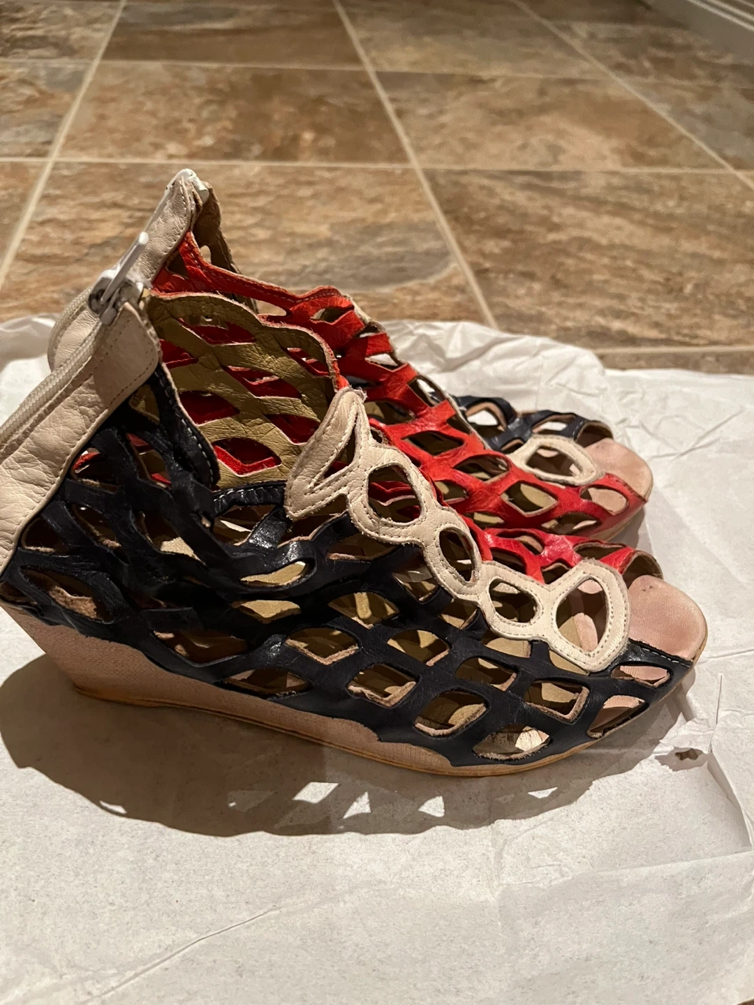Unique and stylish wedge heel sandals in a vibrant mix of red, black, and cream colours! These are a size 9 and feature a distinctive cutout design. They've got some wear, but still have plenty of life left for someone who loves to stand out!