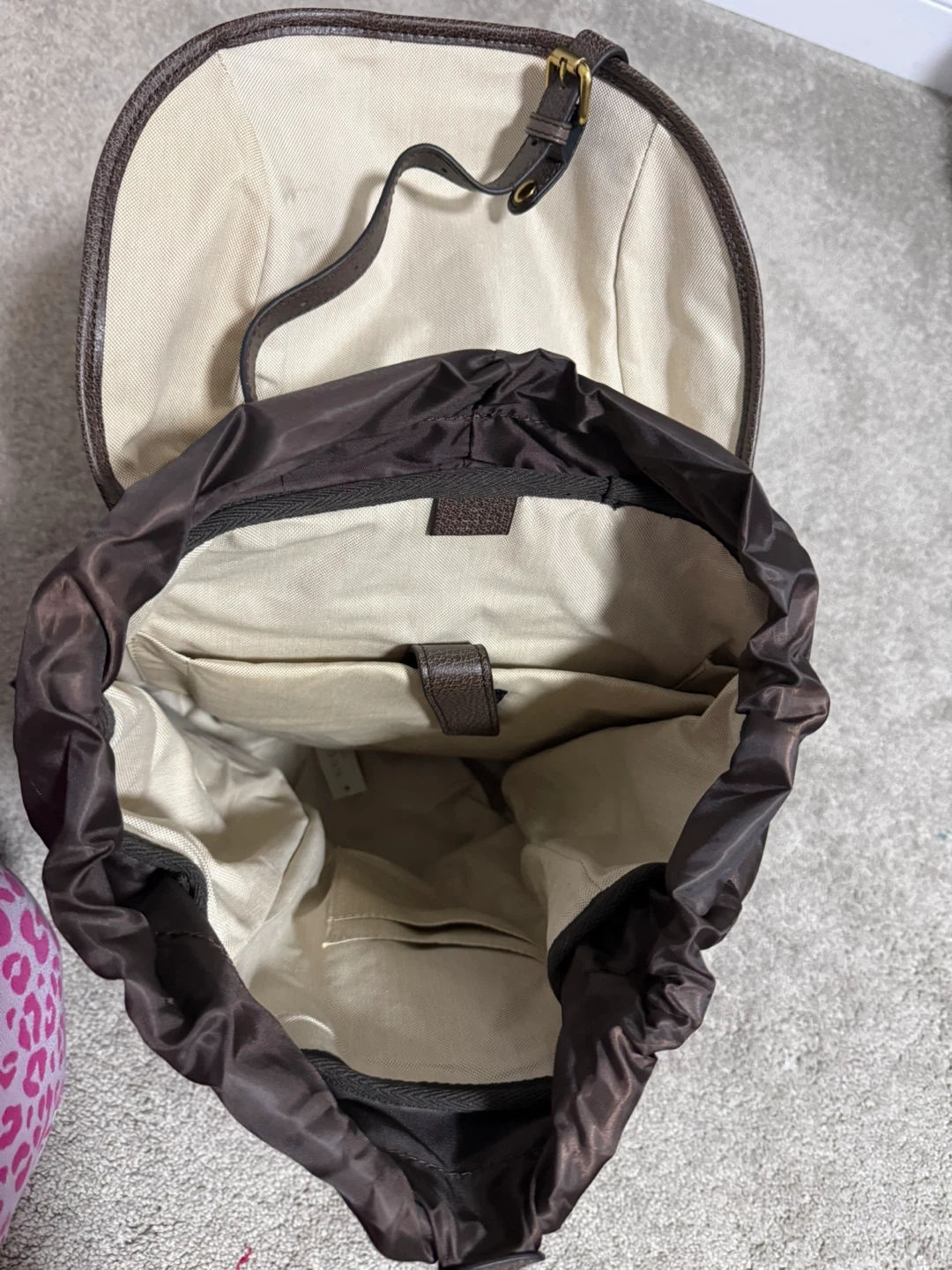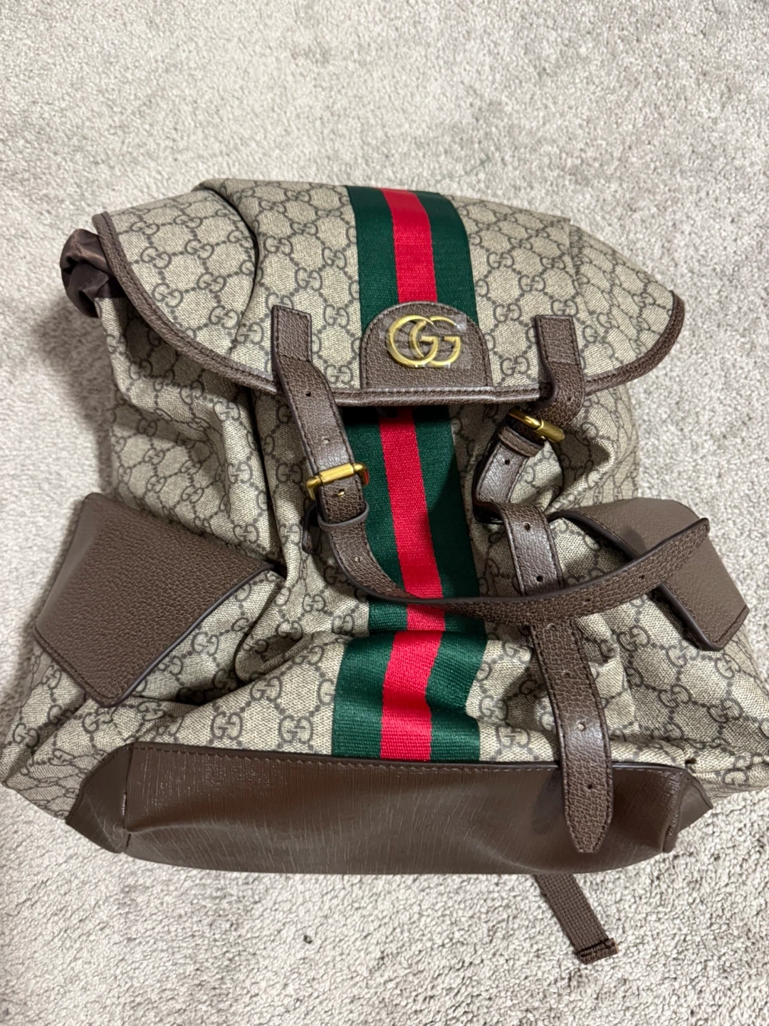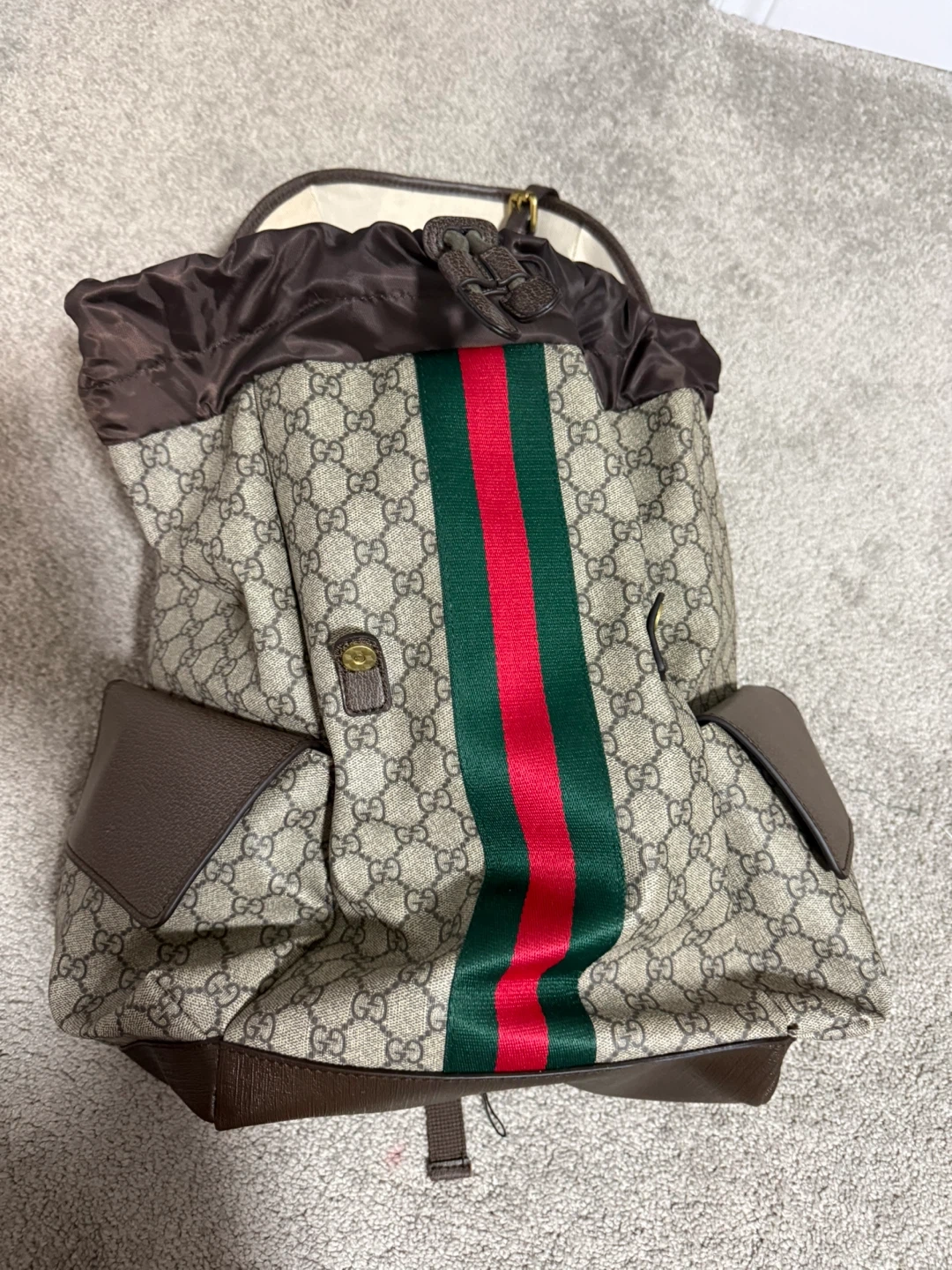This Gucci backpack features the iconic GG Supreme canvas with a brown leather trim and the signature green and red web stripe. It's a stylish and functional bag, perfect for everyday use!