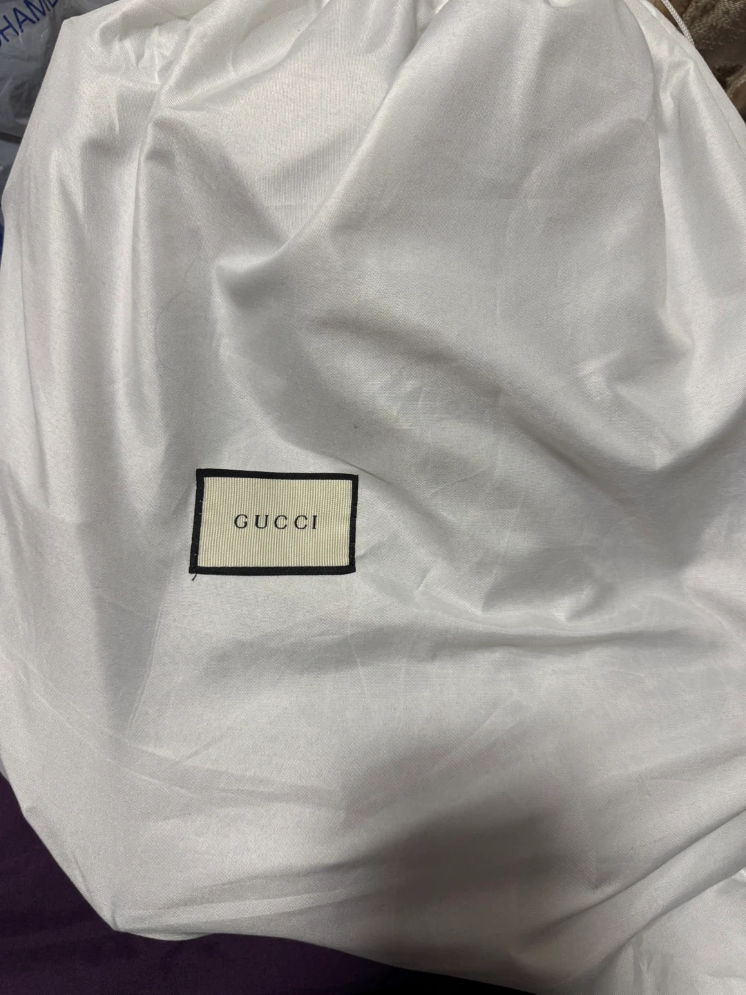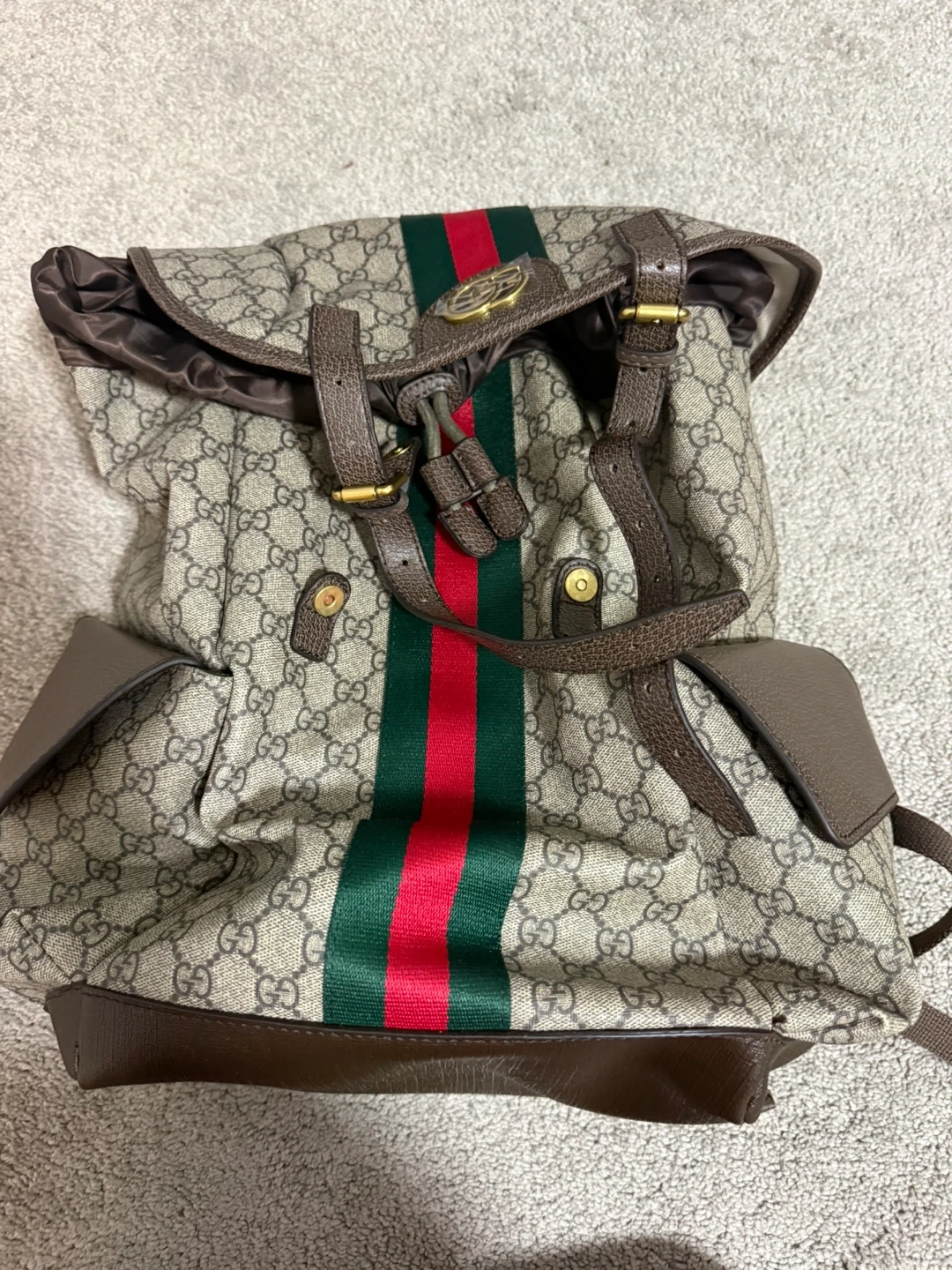 This Gucci backpack features the iconic GG Supreme canvas with a brown leather trim and the signature green and red web stripe. It's a stylish and functional bag, perfect for everyday use!