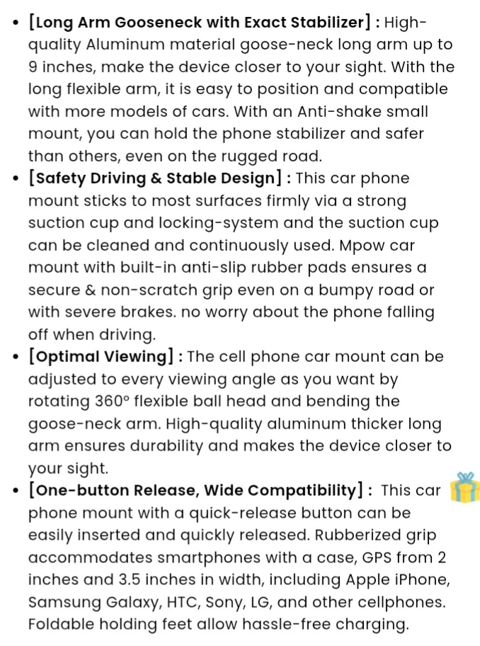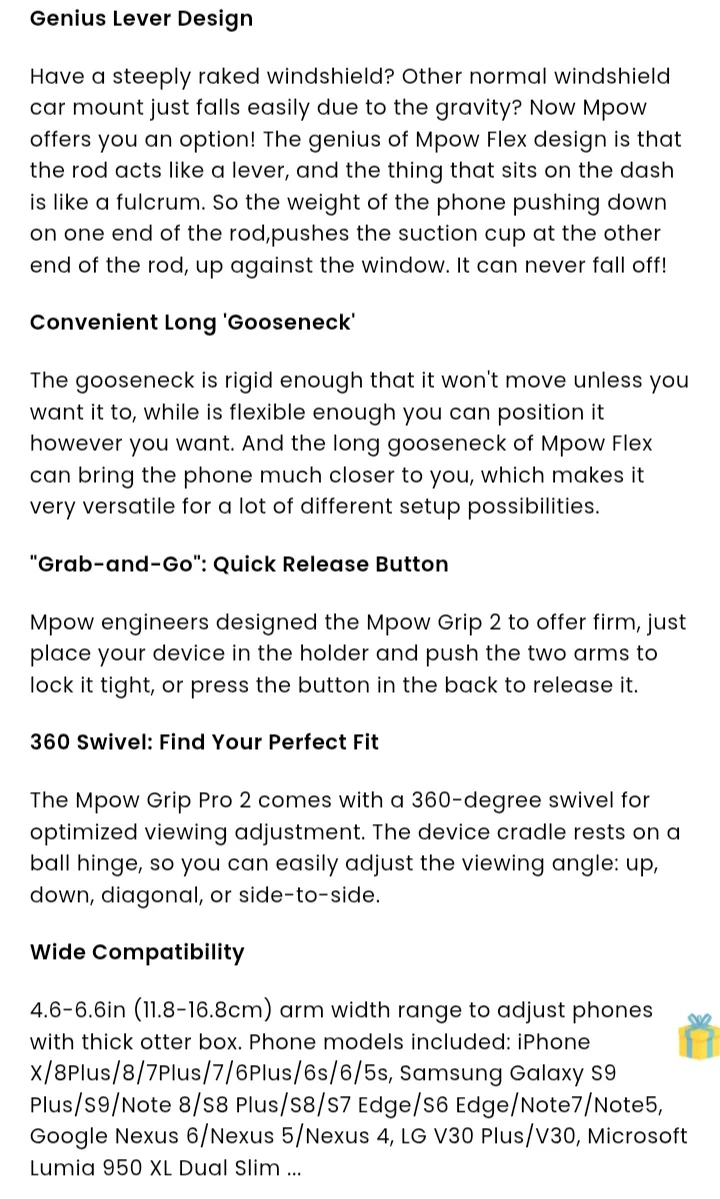 Selling an Mpow 033CB car phone holder! It's a universal case-friendly car mount that works with phones between 4.0-6.5 inches. It features a quick-release button for one-hand operation and foldable feet. The thickness of the phone case should be within 5mm.