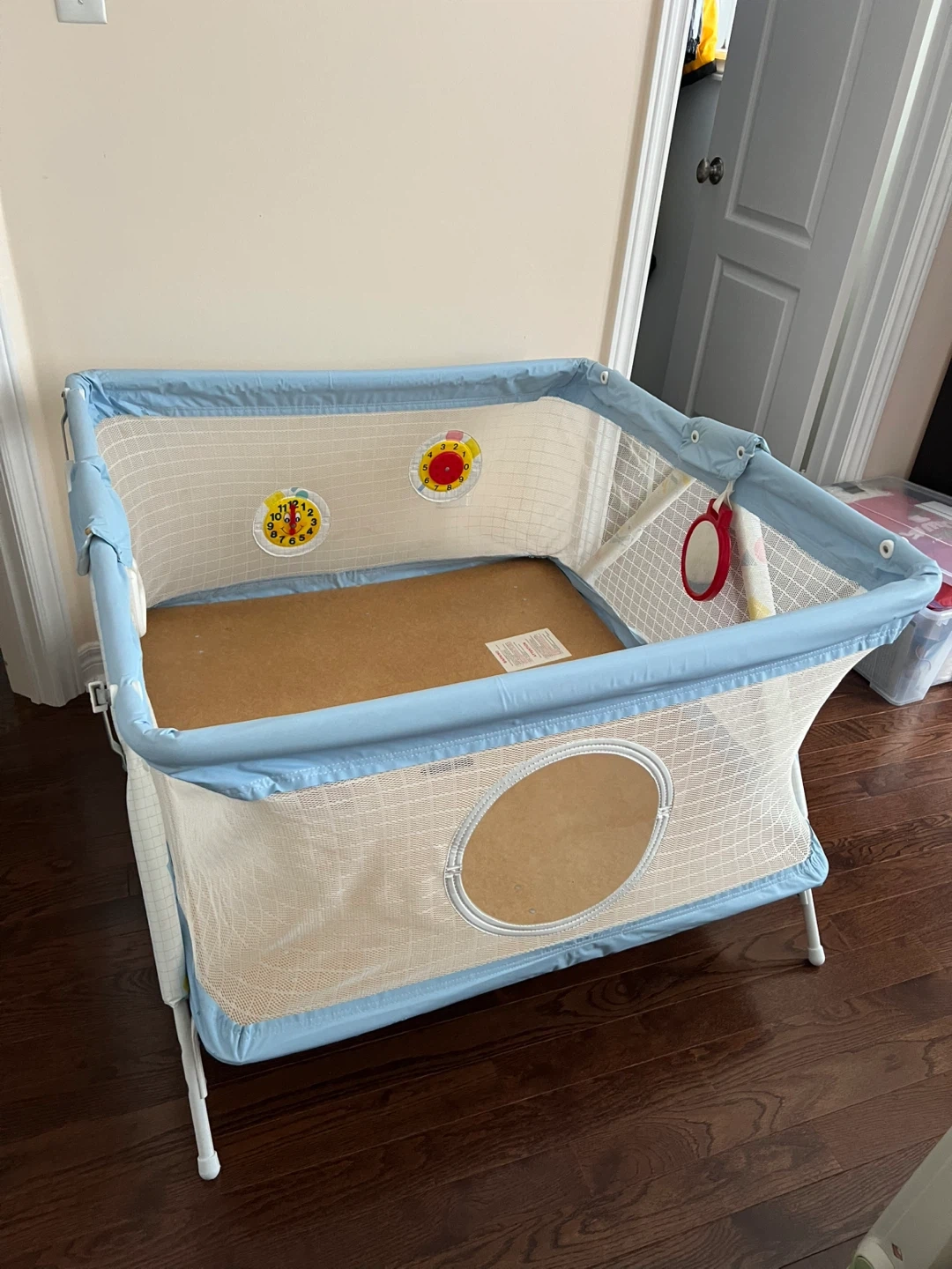 5Selling a baby playpen in good condition! It's blue and white, and perfect for keeping your little one safe while they play. It features mesh sides for visibility and attached toy parts for fun.