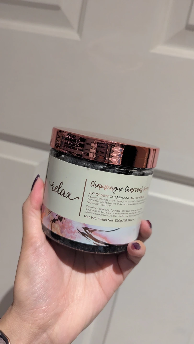 Selling a jar of Mana Kadar Champagne Charcoal Scrub. It's a lovely exfoliant that detoxifies and hydrates your skin. It buffs away dead skin cells and absorbs excess oils to reveal moisturized skin.