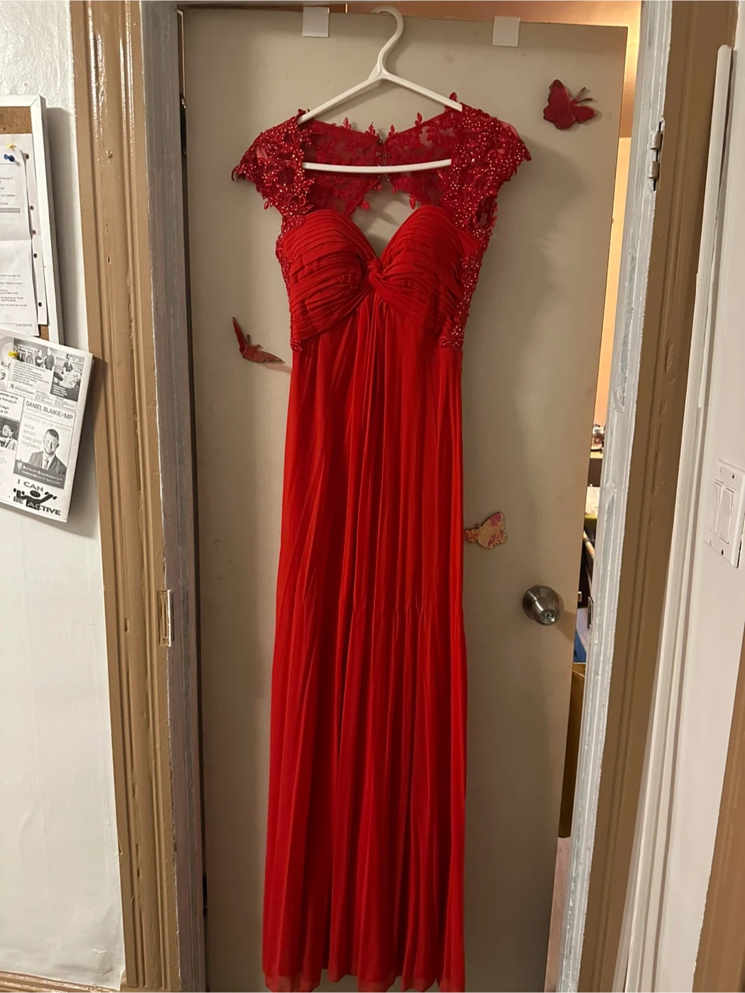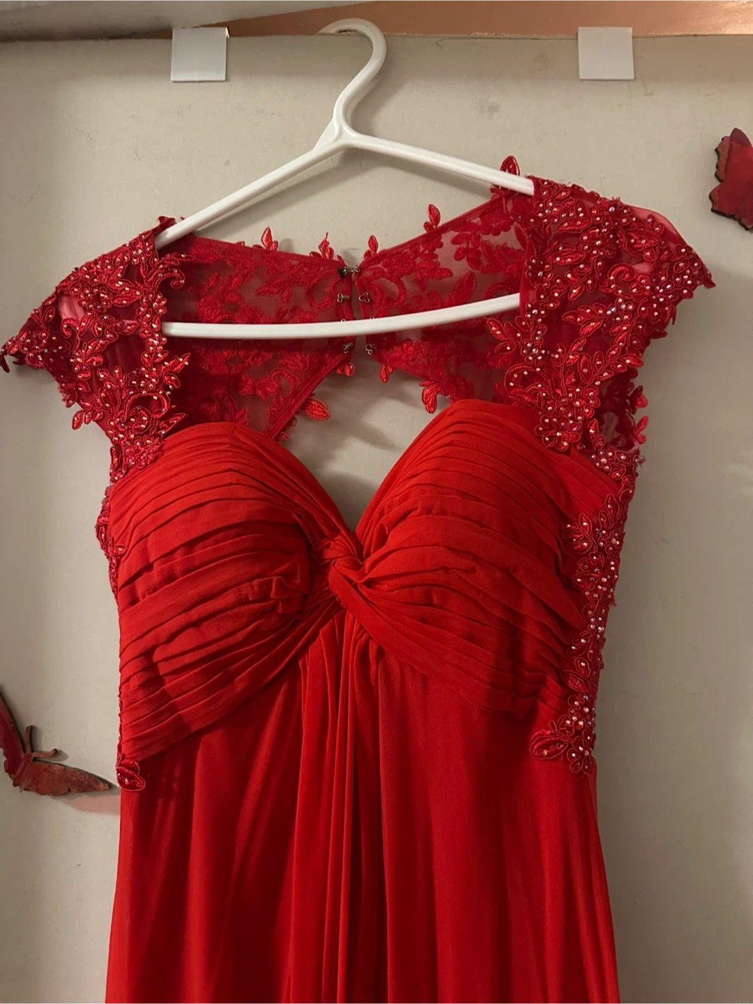 Beautiful red formal dress. It has a lace bodice and a flowing skirt. Perfect for a special occasion!
