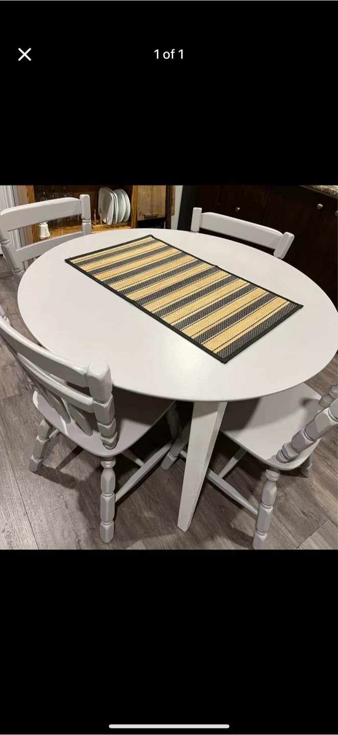 Selling a round dining table with four chairs. The set is painted in a light grey colour. It's perfect for a small dining area or kitchen nook. The table is sturdy and the chairs are comfortable. It would be a great addition to any home!